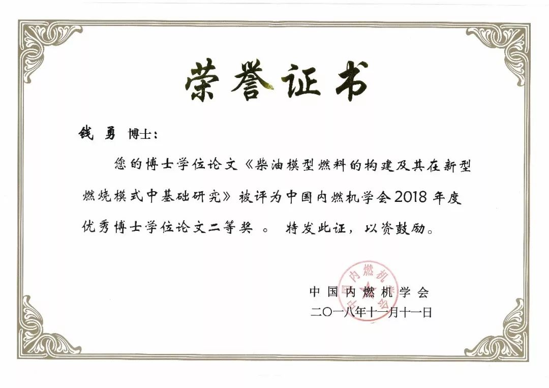 11月11日,中國內(nèi)燃機學會2018年“優(yōu)秀博士學位論文獎”頒獎典禮在無錫舉行。上海交通大學機械與動力工程學院呂興才教授指導的博士生錢勇的學位論文《柴油模型燃料的構建及其在新型燃燒模式中的基礎研究》獲得二等獎。