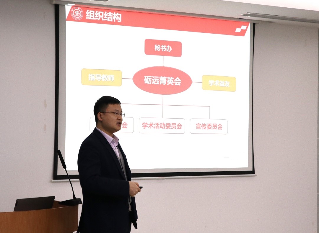李玉陽介紹了礪遠菁英會的建設(shè)背景,建設(shè)宗旨,建設(shè)目標,以及組織結(jié)構(gòu)和成長歷程,他指出,要凝聚全院博士生教育合力,培養(yǎng)博士生學術(shù)和行業(yè)領(lǐng)導力,培養(yǎng)學院博士生精英力量,建成一個富有朝氣,充滿活力的學術(shù)團體。