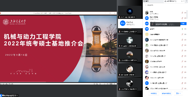 3月16日,機(jī)械與動(dòng)力工程學(xué)院在線舉辦2022年統(tǒng)考碩士生招生基地推介會(huì),學(xué)院院長(zhǎng)、全國(guó)工程專業(yè)學(xué)位研究生教指委委員杜朝輝、副院長(zhǎng)李玉陽(yáng)、校研究生院專業(yè)學(xué)位辦主任張小麗、西北核技術(shù)研究院研究員邱孟通、上海智能制造功能平臺(tái)有限公司副總經(jīng)理趙勇、上海交大四川研究院副院長(zhǎng)王林、項(xiàng)目主管葉菁菁等與廣大學(xué)子齊聚云端,就2022年統(tǒng)考碩士生招生基地復(fù)試及選拔進(jìn)行推介與交流。