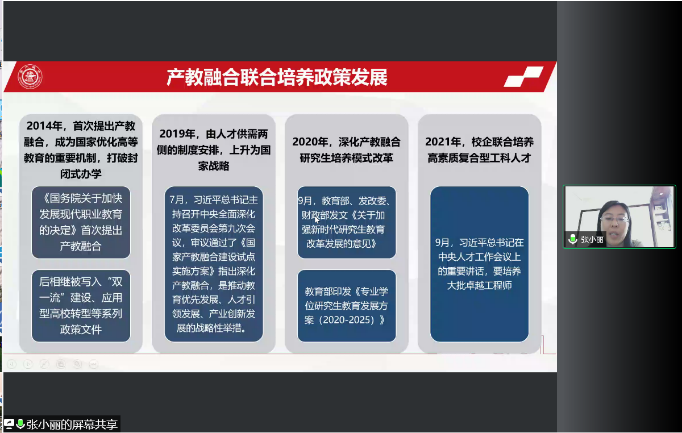張小麗解讀了國(guó)家專業(yè)學(xué)位人才培養(yǎng)改革發(fā)展政策,并就學(xué)校專業(yè)學(xué)位研究生產(chǎn)教融合基地建設(shè)與聯(lián)合培養(yǎng)模式進(jìn)行了詳細(xì)闡述。李玉陽(yáng)分享了機(jī)械動(dòng)力學(xué)院的百年歷程、學(xué)科師資和研究生培養(yǎng)情況,并對(duì)學(xué)院2022年統(tǒng)考碩士招生政策進(jìn)行了解讀。
