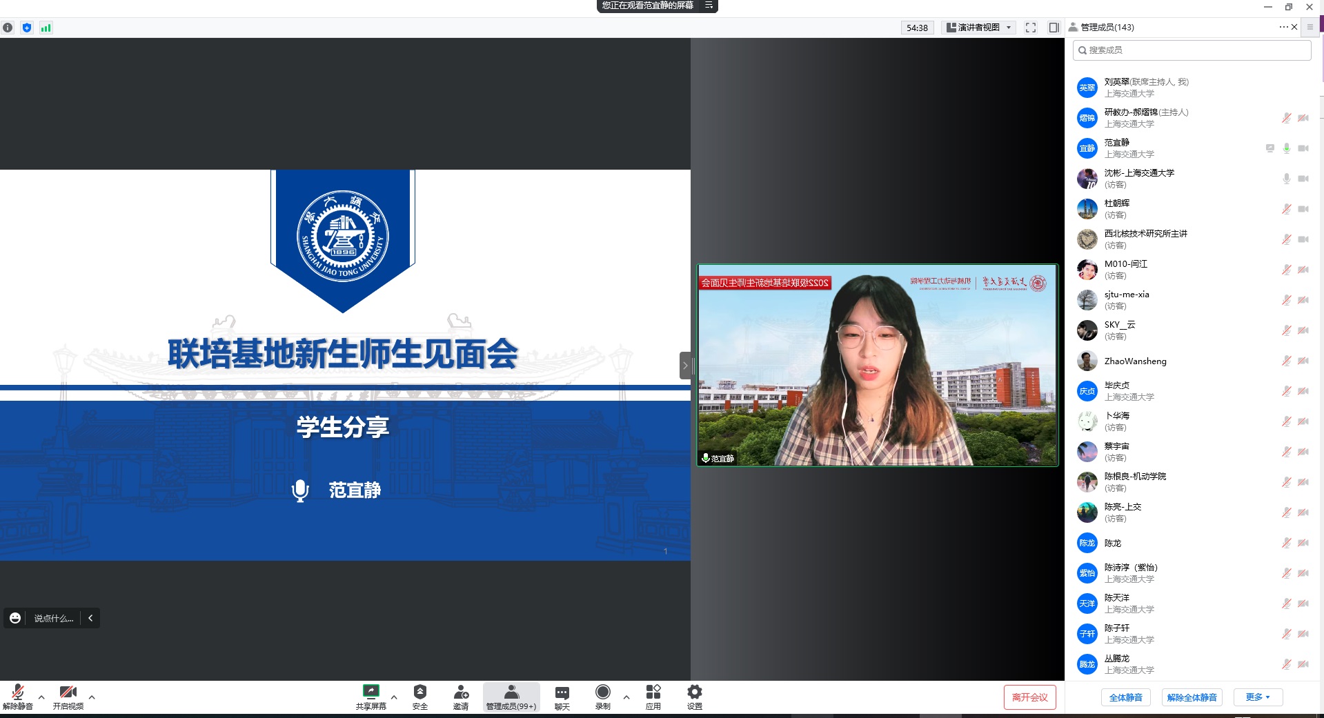 分享交流結(jié)束后,140余位與會(huì)人員進(jìn)行云合影,四個(gè)基地的師生見面會(huì)分會(huì)場(chǎng)啟動(dòng)。四個(gè)聯(lián)培基地的校內(nèi)導(dǎo)師、企業(yè)導(dǎo)師和基地碩士新生對(duì)校內(nèi)導(dǎo)師和企業(yè)導(dǎo)師選導(dǎo)工作、學(xué)習(xí)和實(shí)踐環(huán)節(jié)等方面進(jìn)行了充分地溝通與交流,使得基地新生們對(duì)聯(lián)合培養(yǎng)基地和聯(lián)合培養(yǎng)模式有了更全面的了解。基地新生們紛紛表示,非常期待未來在學(xué)校、學(xué)院和聯(lián)培基地聯(lián)合搭建的平臺(tái)上,在校內(nèi)校外導(dǎo)師組的精心指導(dǎo)下,在企業(yè)的“真刀真槍”的實(shí)干中取得更大的進(jìn)步。