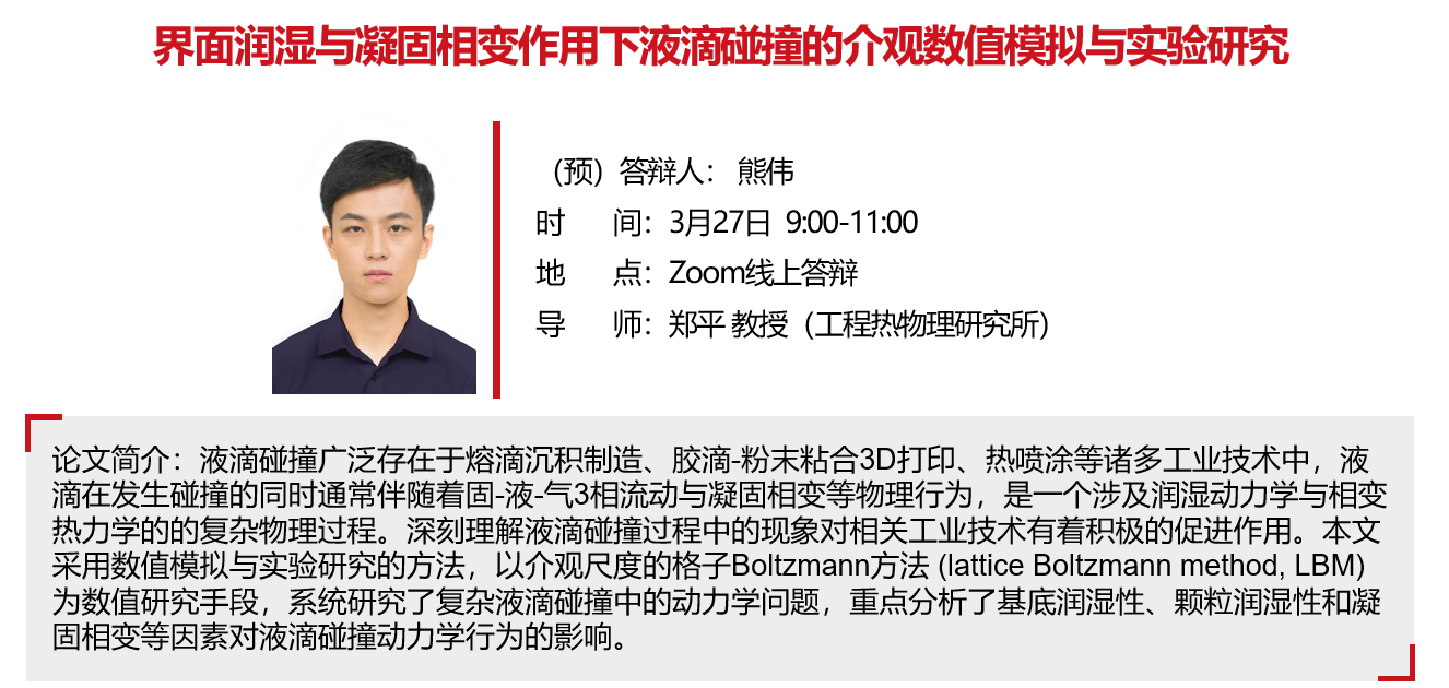 【答辯公告】界面潤濕與凝固相變作用下液滴碰撞的介觀數(shù)值模擬與實(shí)驗(yàn)研究-3月27日