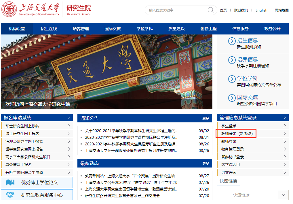 b)打開研究生院主頁(http://www.gs.sjtu.edu.cn),點擊“教師登錄(新系統(tǒng))”: