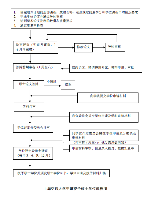 請參照研究生院文件《上海交通大學(xué)申請授予碩士學(xué)位流程》、《上海交通大學(xué)碩士研究生學(xué)位論文評審的相關(guān)事項》。