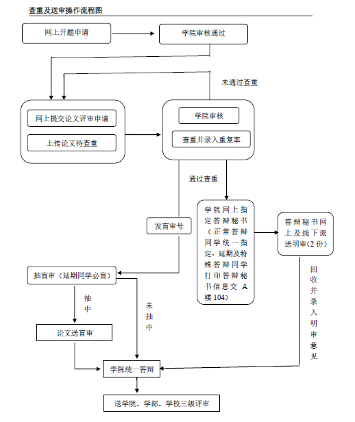 進入正式答辯之前,同學(xué)需要先通過重復(fù)率檢查,并且完成抽盲審的過程,查重及送審的網(wǎng)上操作流程見下圖。