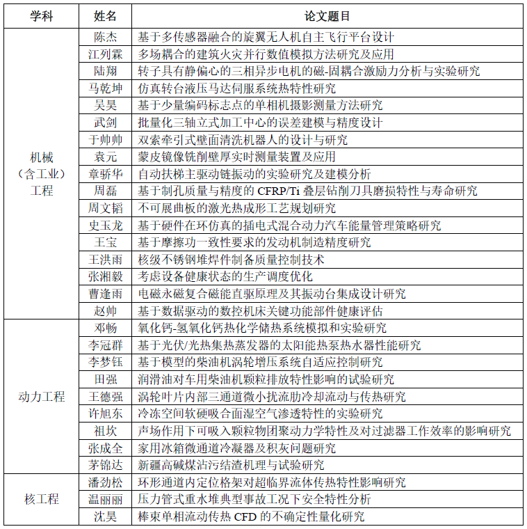 2018年3月,我院碩士畢業(yè)生論文答辯順利結(jié)束,219名碩士生通過(guò)答辯。其中,29名碩士生的學(xué)位論文被推薦為學(xué)院優(yōu)秀碩士學(xué)位論文,機(jī)械(含工業(yè))工程學(xué)科17篇、動(dòng)力工程學(xué)科9篇、核工程學(xué)科3篇。具體名單如下: