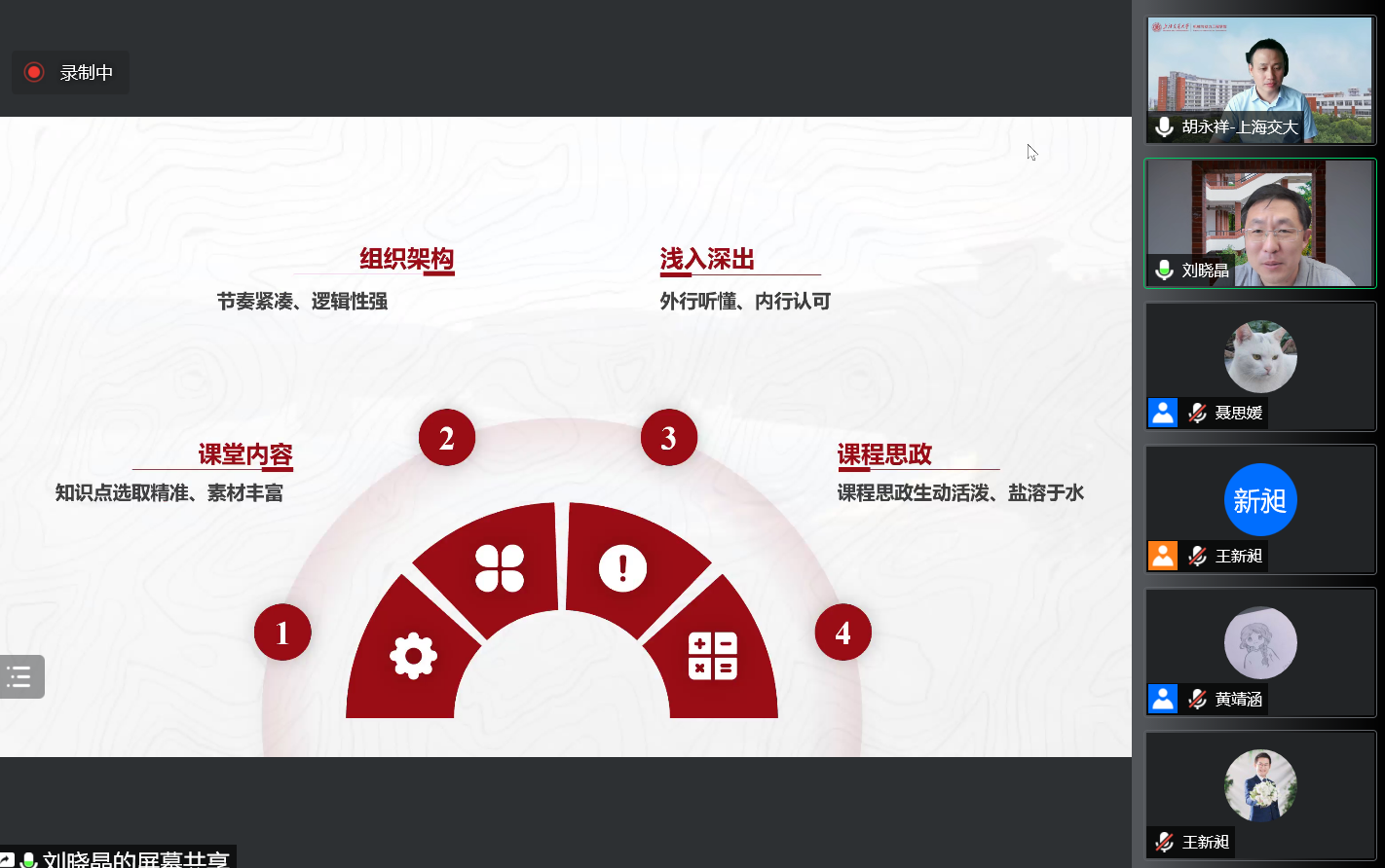 劉曉晶從參賽PPT內(nèi)容、教學(xué)設(shè)計(jì)和教學(xué)反思三個(gè)方面分享經(jīng)驗(yàn),強(qiáng)調(diào)應(yīng)精準(zhǔn)選取知識(shí)點(diǎn),保證教學(xué)內(nèi)容組織架構(gòu)的緊湊性、邏輯性,淺入深出,做到“外行聽(tīng)懂,內(nèi)行認(rèn)可”,并結(jié)合講課內(nèi)容積極開(kāi)展課程思政教育。劉曉晶還建議參賽教師使用引起興趣的導(dǎo)入部分、深入分析問(wèn)題的理論部分及具有工科課程特點(diǎn)的應(yīng)用部分“三段法”展開(kāi)教學(xué),并在課程受眾、學(xué)情分析、課程內(nèi)容、課程難點(diǎn)等方面開(kāi)展教學(xué)反思。