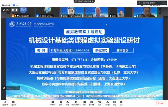 12月24日,“機(jī)械設(shè)計(jì)基礎(chǔ)類課程虛擬實(shí)踐建設(shè)”專題研討活動(dòng)線上舉行,此次活動(dòng)由上海交通大學(xué)牽頭組建的教育部首批虛擬教研室建設(shè)試點(diǎn)“機(jī)械工程專業(yè)虛擬教研室”主辦,機(jī)械原理課程群虛擬教研室、機(jī)械設(shè)計(jì)課程群虛擬教研室、機(jī)械原理及機(jī)械零件(設(shè)計(jì))課程虛擬教研室、西南地區(qū)機(jī)械基礎(chǔ)課程群虛擬教研室、機(jī)械設(shè)計(jì)基礎(chǔ)課程虛擬教研室5家單位共同協(xié)辦。教育部機(jī)械基礎(chǔ)課程教學(xué)指導(dǎo)分委員會(huì)主任閻紹澤、機(jī)械原理課程群虛擬教研室主任王德倫、機(jī)械設(shè)計(jì)課程群虛擬教研室常務(wù)副主任王黎欽、機(jī)械原理及機(jī)械零件(設(shè)計(jì))課程虛擬教研室主任葛文杰、機(jī)械工程專業(yè)虛擬教研室代表、上海交大機(jī)械與動(dòng)力工程學(xué)院副院長(zhǎng)夏唐斌出席活動(dòng)。各高校成員單位領(lǐng)導(dǎo)及教師代表等160余人線上參會(huì),會(huì)議由上海交大“設(shè)計(jì)與制造II”課程負(fù)責(zé)人郭為忠主持。
