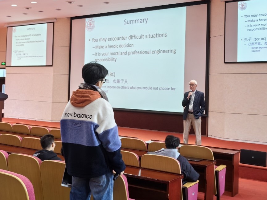 Martin教授長期負(fù)責(zé)賓夕法尼亞州立大學(xué)的國際戰(zhàn)略合作和教育。報告中,Martin介紹了科學(xué)和工程的區(qū)別、工程師的重要價值和重大責(zé)任,并通過豐富的實例,引導(dǎo)學(xué)生思考如何在實際生活中堅守工程倫理和工程師品質(zhì),讓即將步入研究生和工程師生涯的學(xué)生們受益匪淺。Martin還與現(xiàn)場學(xué)生針對更多實際工程問題進(jìn)行交流,寄語大家在職業(yè)生涯中找到興趣點(diǎn),養(yǎng)成終身學(xué)習(xí)的習(xí)慣。