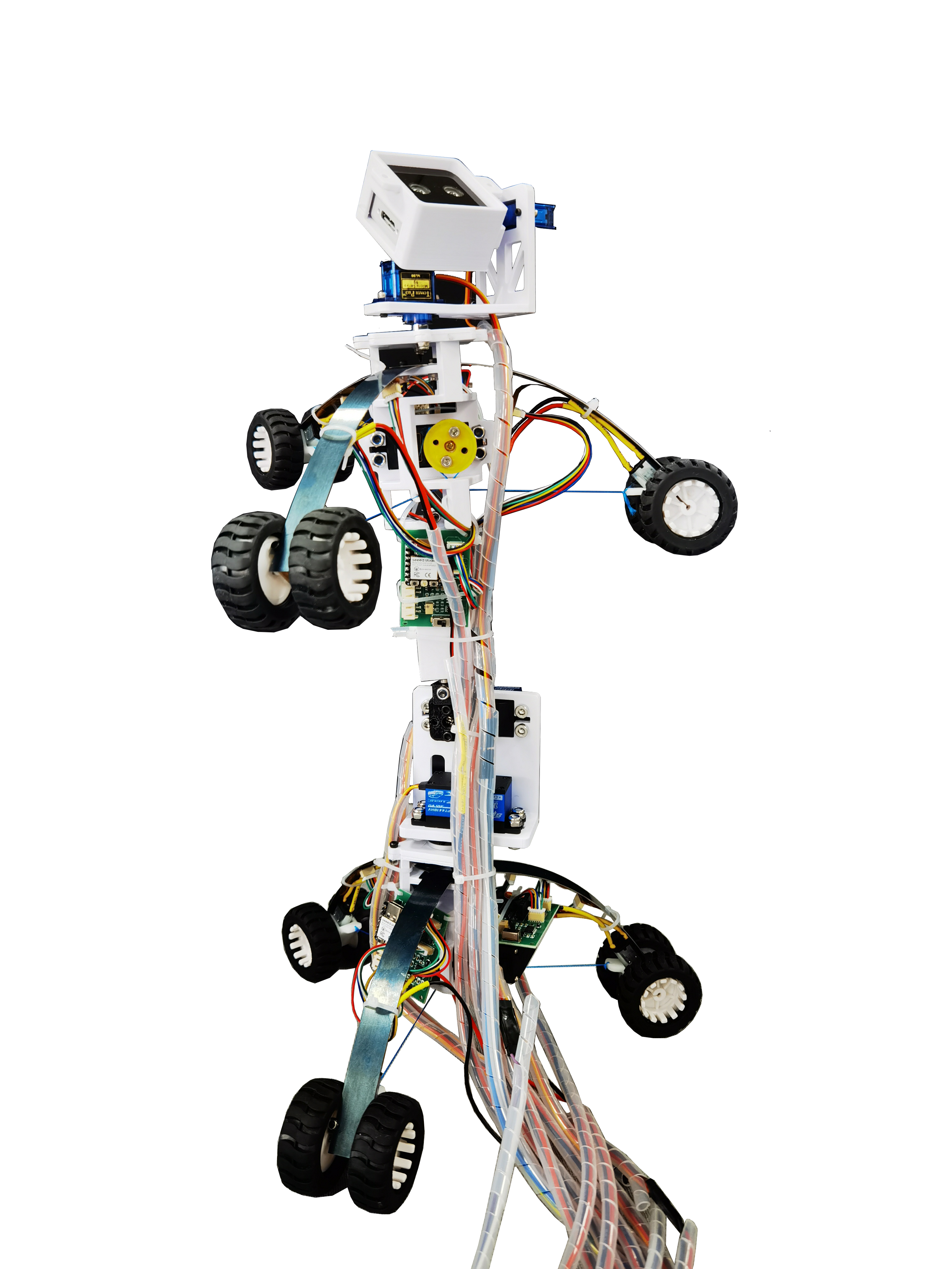 項(xiàng)目設(shè)計(jì)了一款柔性桿整體張拉內(nèi)孔爬行機(jī)器人,能夠?qū)崿F(xiàn)復(fù)雜管道輪腿雙模式運(yùn)動(dòng)和障礙缺陷識(shí)別。項(xiàng)目設(shè)計(jì)了剛?cè)狁詈险w張拉機(jī)構(gòu),實(shí)現(xiàn)輪式、蠕動(dòng)雙運(yùn)動(dòng)模式;建立繩索-柔性桿件聯(lián)合解算模型,實(shí)現(xiàn)柔性桿末端控制;搭建“視觸”多維度環(huán)境實(shí)時(shí)感知系統(tǒng),實(shí)現(xiàn)缺陷、障礙物實(shí)時(shí)檢測和定位,并完成管道點(diǎn)云重建。項(xiàng)目基于“構(gòu)型、建模、感知”三大創(chuàng)新和“機(jī)構(gòu)、觸覺、視覺、控制”四大技術(shù)路線,實(shí)現(xiàn)適應(yīng)性強(qiáng)、實(shí)時(shí)感知的航空發(fā)動(dòng)機(jī)內(nèi)孔爬行機(jī)器人設(shè)計(jì)制造,滿足企業(yè)需求。