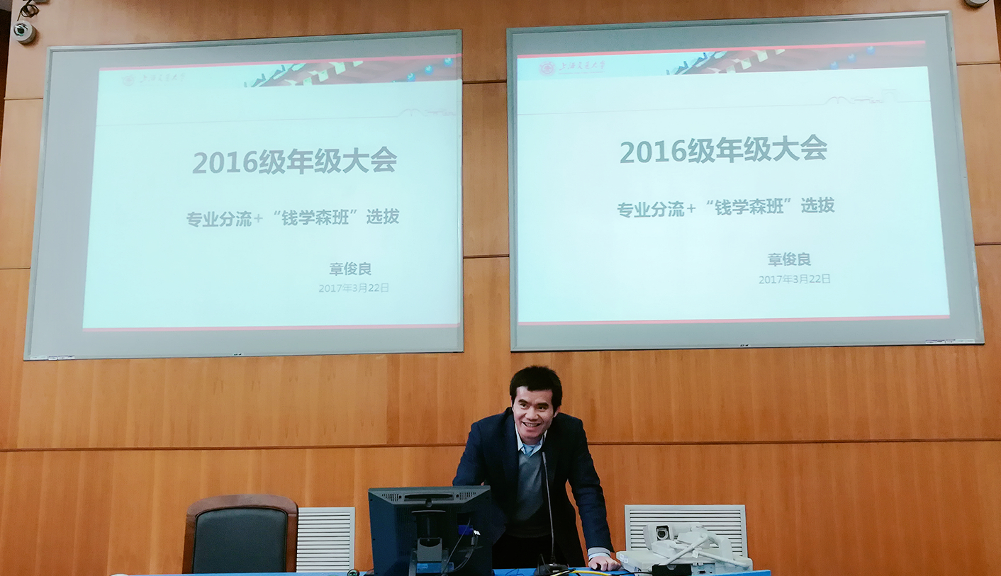 2017年3月22日,機(jī)械與動(dòng)力工程學(xué)院2016級本科生專業(yè)分流、“錢學(xué)森班”選拔介紹會(huì)在上院500順利召開。學(xué)院副院長章俊良教授、本科教務(wù)辦主任吳艷瓊老師、年級思政王國鋒、陳龍老師、年級教務(wù)袁霞老師以及2016級本科生參加了本次會(huì)議。