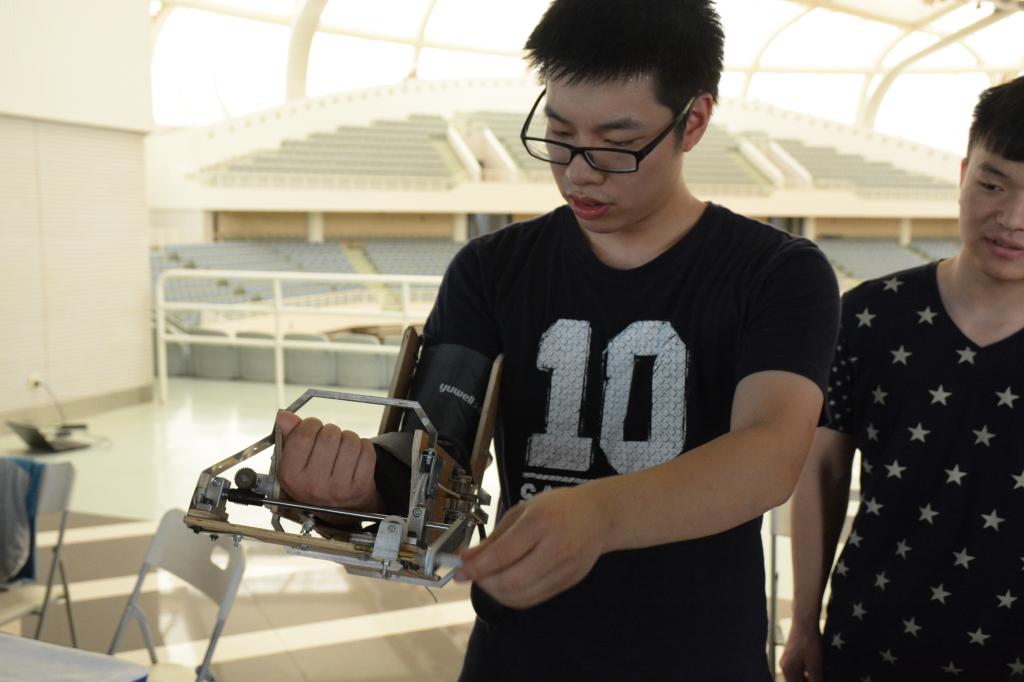 在現(xiàn)有市場中,幾乎所有的商用肘關(guān)節(jié)康復(fù)機(jī)均屬于被動式康復(fù)機(jī)(CPM),售價昂貴,設(shè)備笨重,操作復(fù)雜,需要專業(yè)人士指導(dǎo)使用。上海交大機(jī)械與動力工程學(xué)院與上海交大附屬第六人民醫(yī)院康復(fù)科合作,指導(dǎo)學(xué)生從廉價便攜、操作簡便的角度出發(fā),設(shè)計的這款便攜式主動肘關(guān)節(jié)康復(fù)機(jī)使用純手動操作,避免了因電動而可能帶給患者的二次傷害。并且,機(jī)器結(jié)構(gòu)簡單,操作方便,質(zhì)量輕,便攜性好,成本低廉。這款醫(yī)工結(jié)合的平價康復(fù)“神器”將能真正做到讓每一位有需要的患者不為高昂的康復(fù)費用而苦惱,也不用為需要經(jīng)常往返醫(yī)院而奔波。