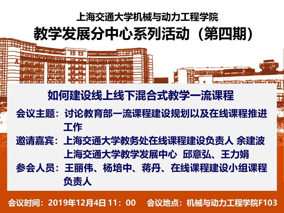 為進(jìn)一步討論教育部一流課程建設(shè)規(guī)劃以及在線課程推進(jìn)工作,特邀請上海交通大學(xué)慕課推進(jìn)辦公室主任余建波、上海交通大學(xué)教學(xué)發(fā)展中心邱意弘及王力娟,就“如何建設(shè)線上線下混合式教學(xué)一流課程”為主題展開上海交通大學(xué)機(jī)械與動力工程學(xué)院教學(xué)發(fā)展分中心系列活動(第四期)!