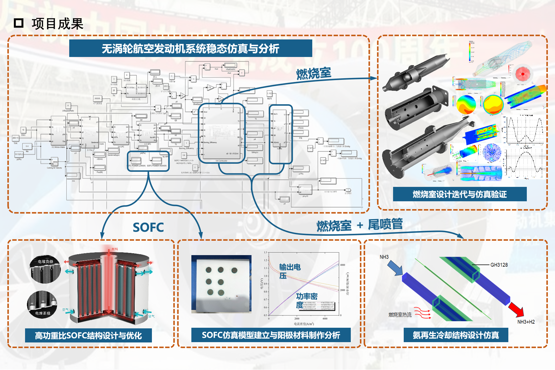 3. 分別針對無渦輪航空發(fā)動機和固體氧化物燃料電池系統(tǒng)開展設計和模擬,構(gòu)建氨氣燃燒室在線裂解模型和航發(fā)整體冷卻模型,形成氨氫融合無渦輪航空混合動力系統(tǒng)模型,并開展模型參數(shù)化分析,獲得零碳航空動力創(chuàng)新設計思路;