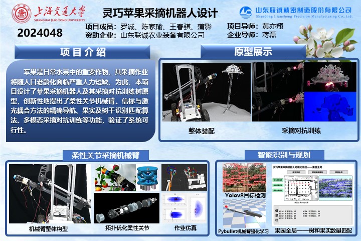 隨著我國社會結(jié)構(gòu)老齡化日益嚴(yán)重,蘋果作為日常水果中的重要作物,其采摘作業(yè)正面臨嚴(yán)重的人力短缺問題,果園無人化、智能化已然成為了智慧農(nóng)業(yè)發(fā)展的主要趨勢。本項目設(shè)計了靈巧蘋果采摘機(jī)器人系統(tǒng)及其采摘對抗訓(xùn)練樹原型,創(chuàng)新性地設(shè)計并實現(xiàn)了柔性關(guān)節(jié)機(jī)械臂、信標(biāo)與激光耦合方法的精確導(dǎo)航、果實及樹干識別匹配算法、多模態(tài)采摘對抗訓(xùn)練等功能,最終實現(xiàn)了蘋果采摘機(jī)器人系統(tǒng)的摘果功能與采摘對抗訓(xùn)練。