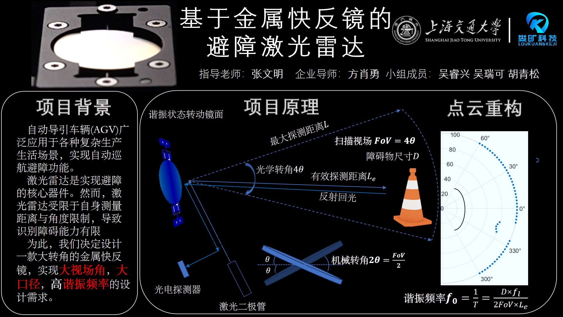 目前避障激光雷達(dá)主要通過微型旋轉(zhuǎn)電機實現(xiàn)激光對障礙物的掃描,存在掃描頻率低、體積大和壽命短等弊端。相較于旋轉(zhuǎn)電機,金屬快反鏡具有體積小、掃描頻率高、可靠性高、成本低等優(yōu)勢,但也面臨光學(xué)口徑小和掃描角度小的問題。本項目旨在改善上述兩個問題,并搭建避障激光雷達(dá)原理樣機,進(jìn)行功能驗證。