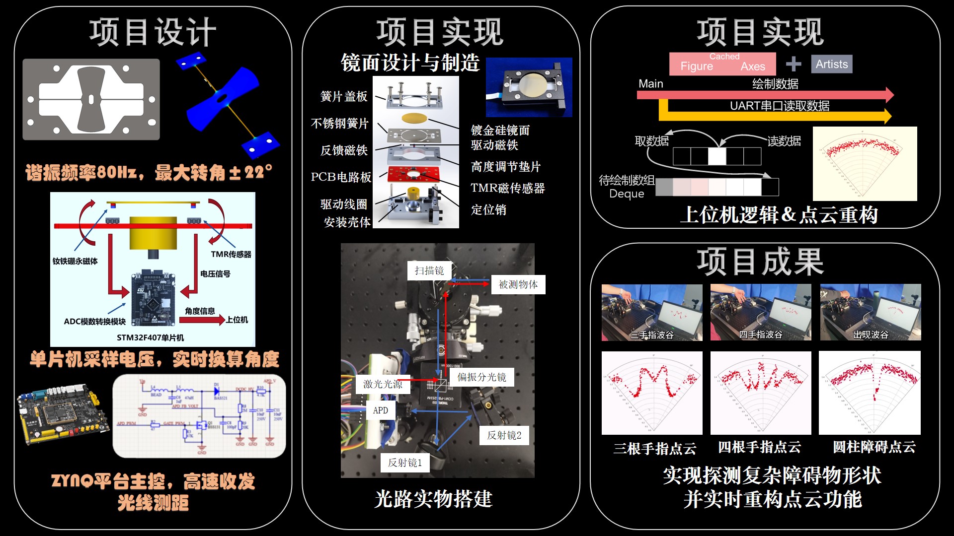 本項目提出一款基于大口徑大轉(zhuǎn)角的金屬掃描鏡,實現(xiàn)了更大的掃描視場和更遠(yuǎn)的探測距離。視場角在80°時工作26小時仍十分穩(wěn)定。采用磁傳感器實現(xiàn)了角度反饋,并實現(xiàn)了諧振式掃描鏡的閉環(huán)控制。搭建了激光雷達(dá)系統(tǒng)光路,實現(xiàn)了對不同形狀物體的辨識以及多物體的辨識,相同光路條件下實驗對比得到本項目的20mm口徑掃描鏡的探測距離為5mm直徑掃描鏡的兩倍。