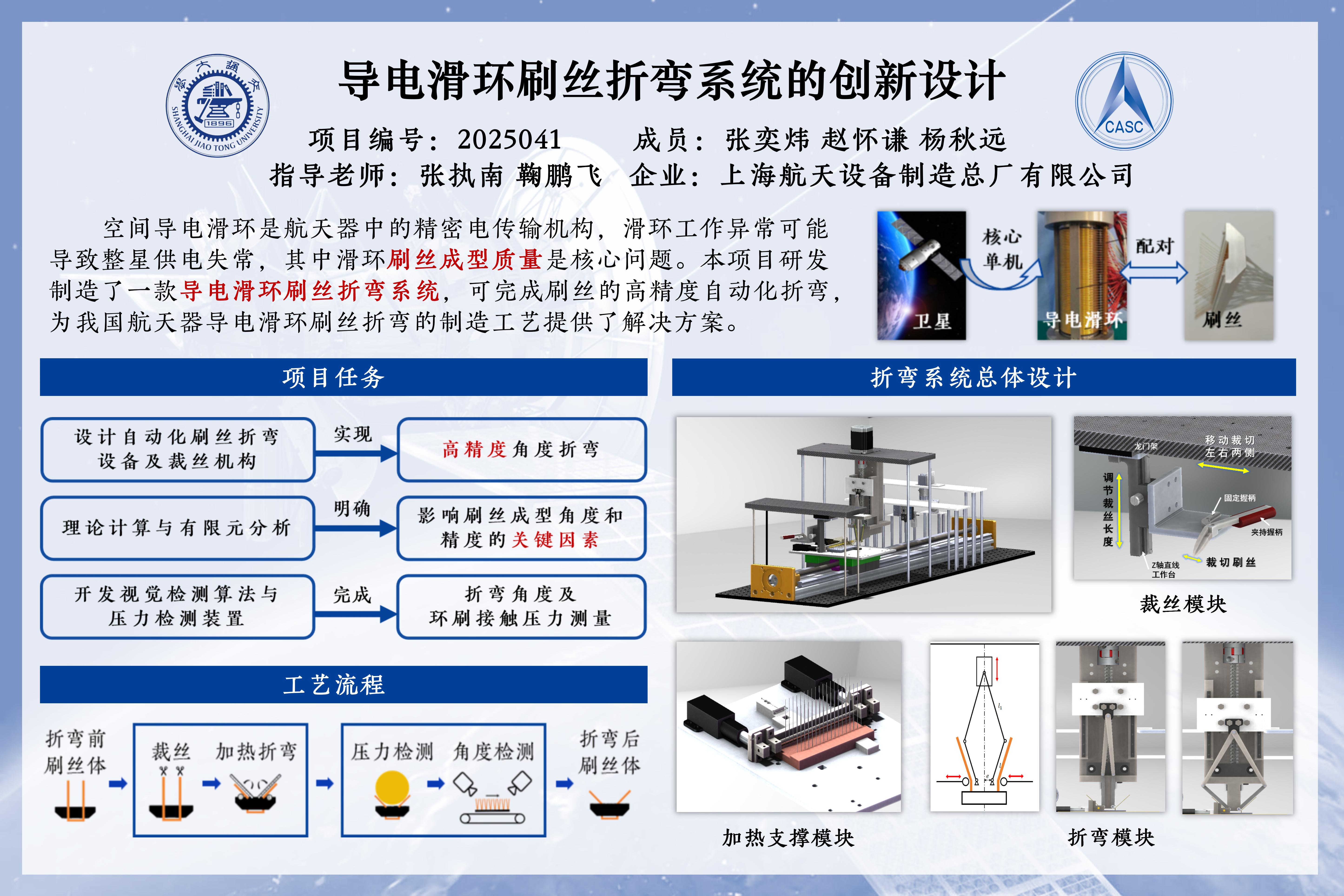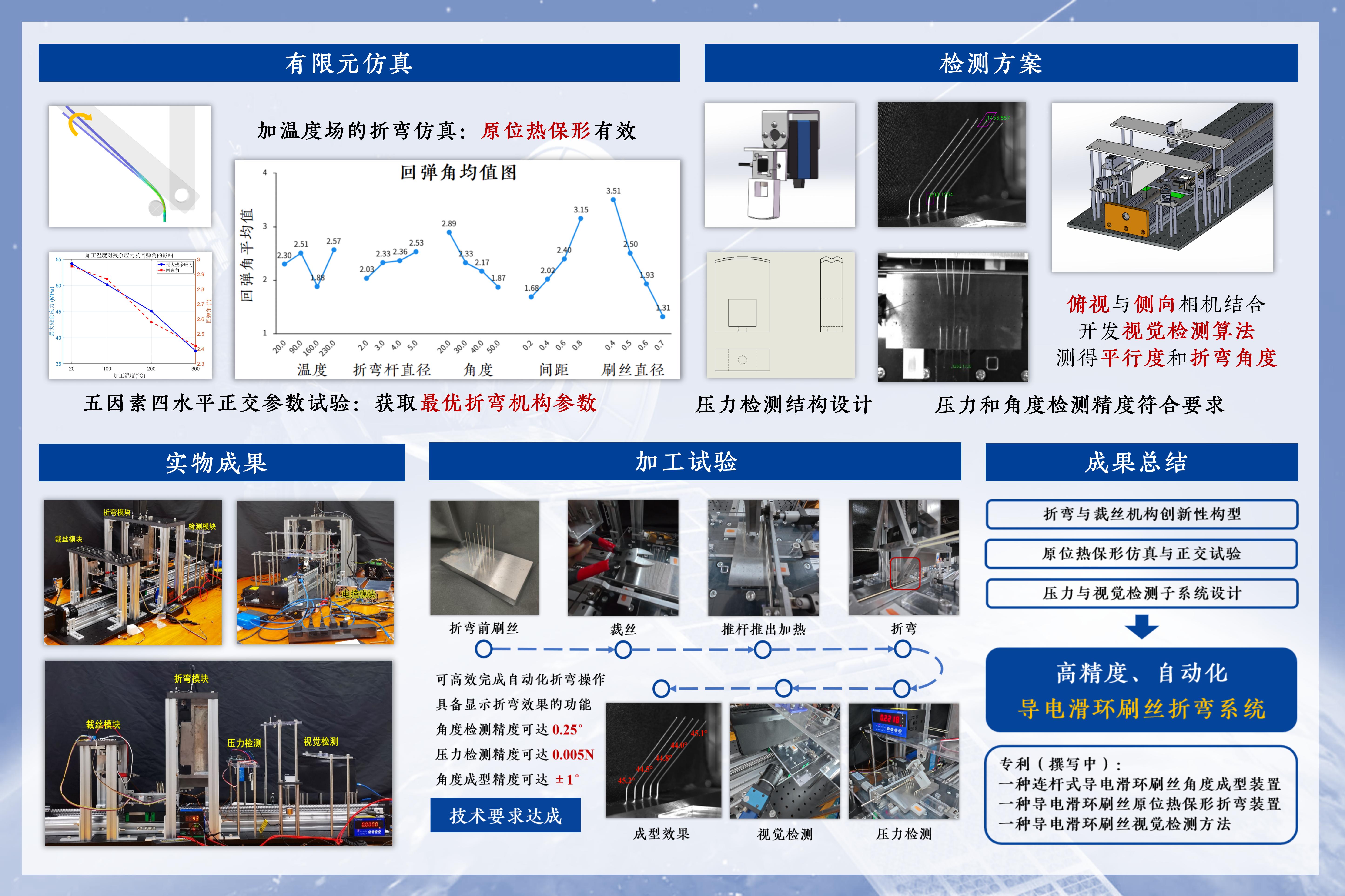 發(fā)展高可靠、長(zhǎng)壽命、高精度與高穩(wěn)定度航天器是世界各國(guó)航天事業(yè)發(fā)展的必然趨勢(shì)。作為航天器中的核心單機(jī),導(dǎo)電滑環(huán)的性能直接決定了系統(tǒng)的穩(wěn)定性與可靠性,其中刷絲折彎過(guò)程中的角度控制對(duì)滑環(huán)的穩(wěn)定性和使用壽命至關(guān)重要。當(dāng)前導(dǎo)電滑環(huán)的制造中,存在刷絲折彎后回彈導(dǎo)致的工藝一致性差、人工折彎效率低的問(wèn)題。為解決上述問(wèn)題,本項(xiàng)目通過(guò)開(kāi)展裁絲與折彎?rùn)C(jī)構(gòu)設(shè)計(jì)、折彎有限元仿真、壓力與角度檢測(cè)系統(tǒng)設(shè)計(jì),創(chuàng)新設(shè)計(jì)了一款導(dǎo)電滑環(huán)刷絲折彎系統(tǒng),提高了導(dǎo)電滑環(huán)的制造精度和生產(chǎn)效率。