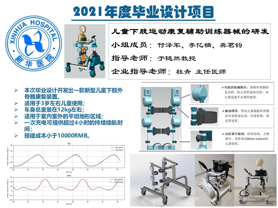 1、完成了設(shè)計的任務(wù)目標,開發(fā)出一款新型兒童下肢外骨骼康復(fù)裝置并配套開發(fā)出控制系統(tǒng)、人機交互界面和步態(tài)規(guī)劃仿真軟件,提供了體重支撐、阻力訓(xùn)練、直線行走等輔助功能。