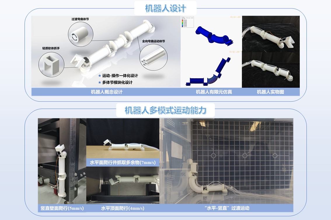 本項(xiàng)目對(duì)軟體驅(qū)動(dòng)器材料、形狀、長度等設(shè)計(jì)參數(shù)提出了優(yōu)化,創(chuàng)新了仿生陣列式吸盤,設(shè)計(jì)了一款軟體機(jī)器人。該軟體機(jī)器人展現(xiàn)出多模式運(yùn)動(dòng)能力,可以進(jìn)行場(chǎng)景過渡,與軟體抓手配合后,能夠?qū)Ψ且?guī)則多余物進(jìn)行抓取。本項(xiàng)目設(shè)計(jì)了相應(yīng)的氣路和電路,集成了氣動(dòng)控制系統(tǒng),實(shí)現(xiàn)了對(duì)軟體機(jī)器人的協(xié)同控制。經(jīng)實(shí)驗(yàn)驗(yàn)證,該軟體機(jī)器人成功執(zhí)行了運(yùn)動(dòng)和抓取的任務(wù)。