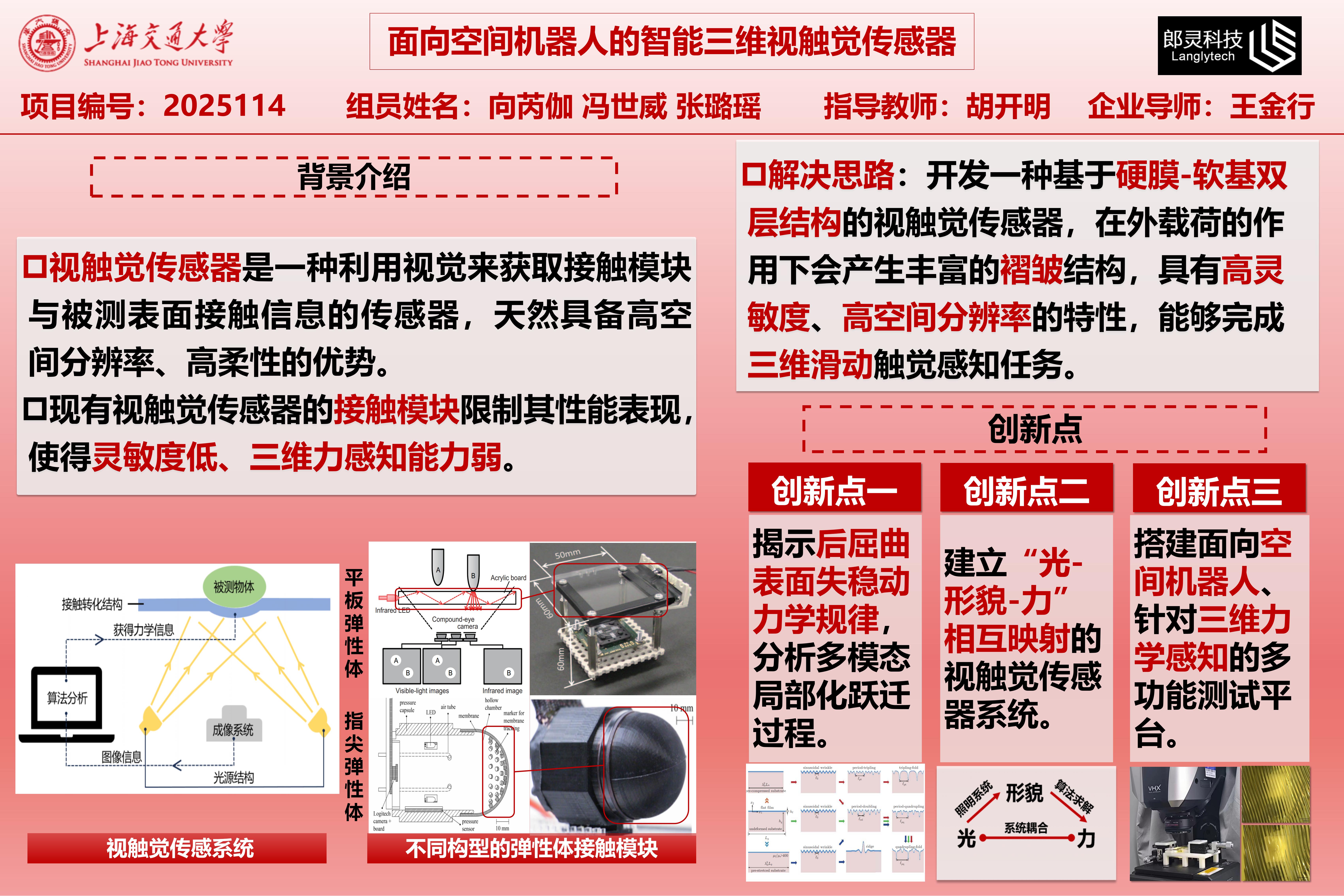 現(xiàn)代航天領(lǐng)域中,空間機(jī)器人因承擔(dān)空間站維護(hù)、衛(wèi)星檢修及太空碎片清理等任務(wù),亟需具備高精度三維觸覺感知能力以應(yīng)對(duì)非合作目標(biāo)的復(fù)雜交互。然而,現(xiàn)有觸覺傳感器在空間分辨率、柔性曲面適應(yīng)性與三維力學(xué)解耦方面仍存在明顯不足。為此,本項(xiàng)目提出基于表面失穩(wěn)力學(xué)自組裝微納結(jié)構(gòu)的新型三維視觸覺傳感器,通過雙層膜基系統(tǒng)的褶皺動(dòng)態(tài)響應(yīng)實(shí)現(xiàn)高靈敏度、高空間分辨率的觸覺感知,其特有的屈曲變形機(jī)制可有效適應(yīng)復(fù)雜曲面的三維滑觸力檢測需求。