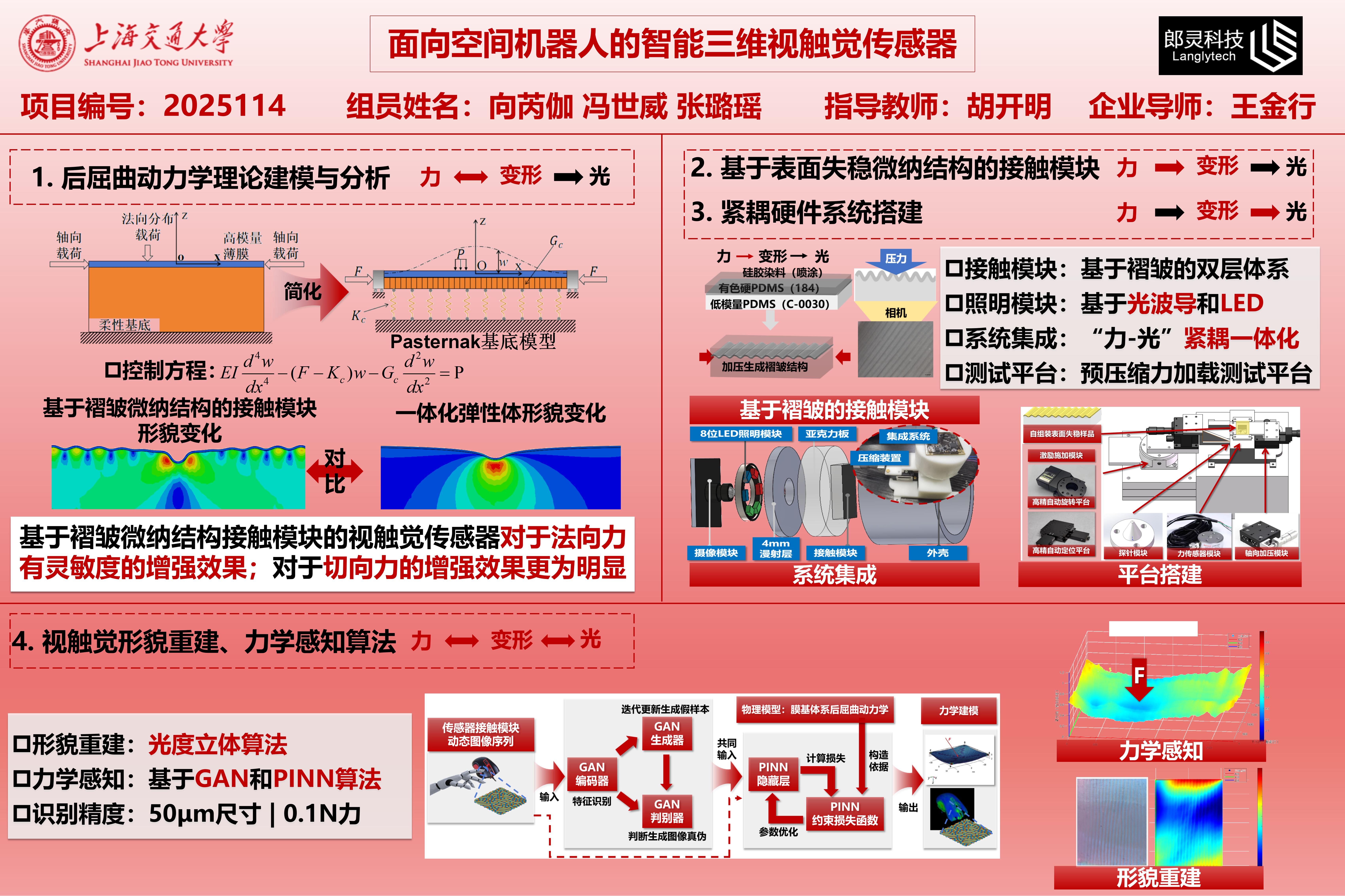 本項(xiàng)目建立了三維滑動(dòng)接觸下膜基系統(tǒng)后屈曲靜力學(xué)和動(dòng)力學(xué)理論模型,結(jié)合有限元仿真與微納壓痕實(shí)驗(yàn)揭示應(yīng)變能主導(dǎo)的多模態(tài)躍遷規(guī)律。其次集成了RGB光波導(dǎo)照明與攝像模塊的視觸覺系統(tǒng),利用褶皺形變的光學(xué)編碼特性實(shí)現(xiàn)接觸力的多維度解析。開發(fā)了基于GAN和PINN的觸覺力重構(gòu)算法,通過耦合理論模型與實(shí)驗(yàn)數(shù)據(jù)實(shí)現(xiàn)三維接觸力的高精預(yù)測。研究突破傳統(tǒng)傳感器剛性結(jié)構(gòu)限制,創(chuàng)新性地將力學(xué)失穩(wěn)轉(zhuǎn)化為感知優(yōu)勢,設(shè)計(jì)可擴(kuò)展應(yīng)用于空間機(jī)器人末端執(zhí)行器,為在軌服務(wù)的自主化升級(jí)提供核心技術(shù)支撐。