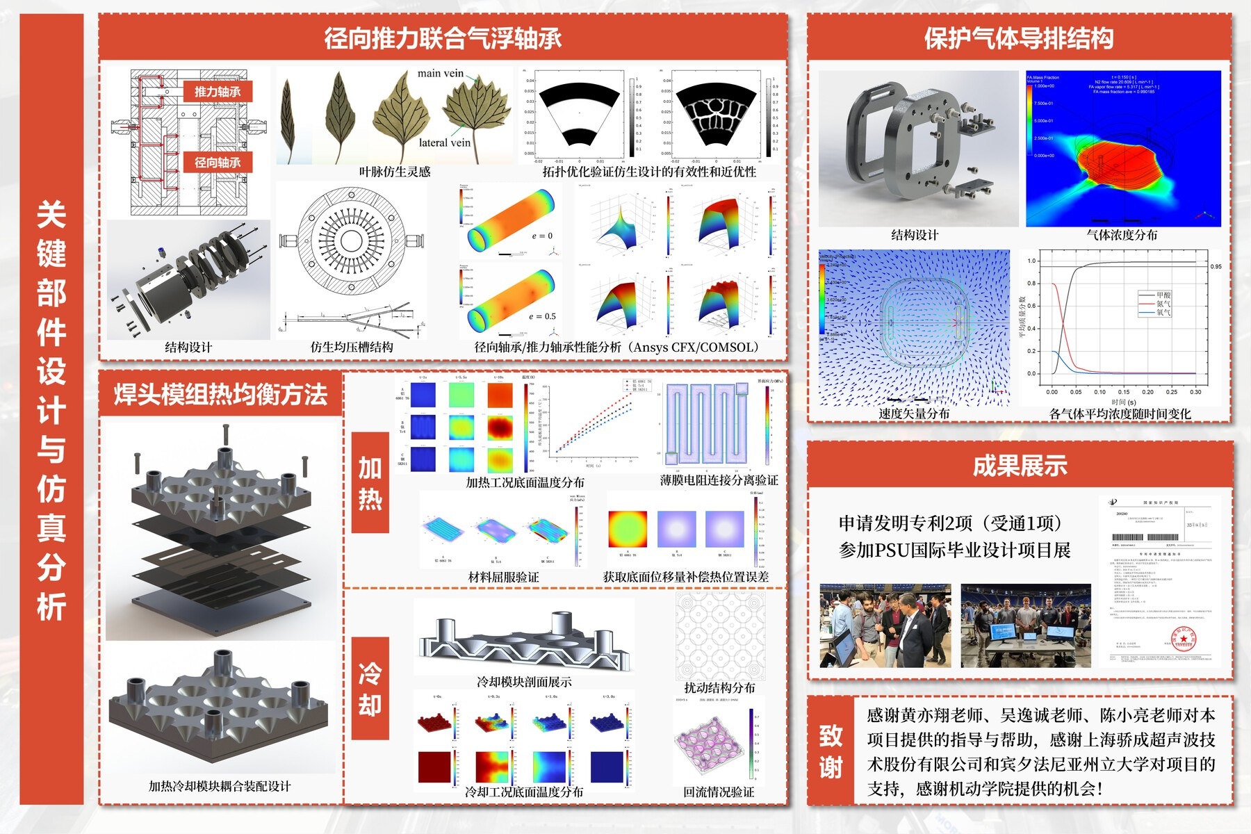 本項(xiàng)目設(shè)計與開發(fā)了一套多自由度焊頭模組,能夠利用高精度運(yùn)動控制系統(tǒng)達(dá)到一定的重復(fù)定位精度和XY軸共面度要求。同時,在整套裝置中引入加熱冷卻模塊,提出了兼顧升溫響應(yīng)與散熱效率的熱控方案。此外,通過對于保護(hù)氣體導(dǎo)排結(jié)構(gòu)與氣浮軸承的設(shè)計開發(fā),提出了高效導(dǎo)氣路徑方案以及仿生均壓槽結(jié)構(gòu)的氣浮軸承設(shè)計,實(shí)現(xiàn)焊頭局部氣體環(huán)境的調(diào)控與高性能非接觸支撐。目前,本項(xiàng)目有兩項(xiàng)發(fā)明專利,分別是《一種用于芯片鍵合的氣體靜壓軸承及鍵合組件》(專利申請已受理)與《集成于芯片鍵合焊頭模組中的加熱冷卻裝置》(已提交發(fā)明專利申報材料)。