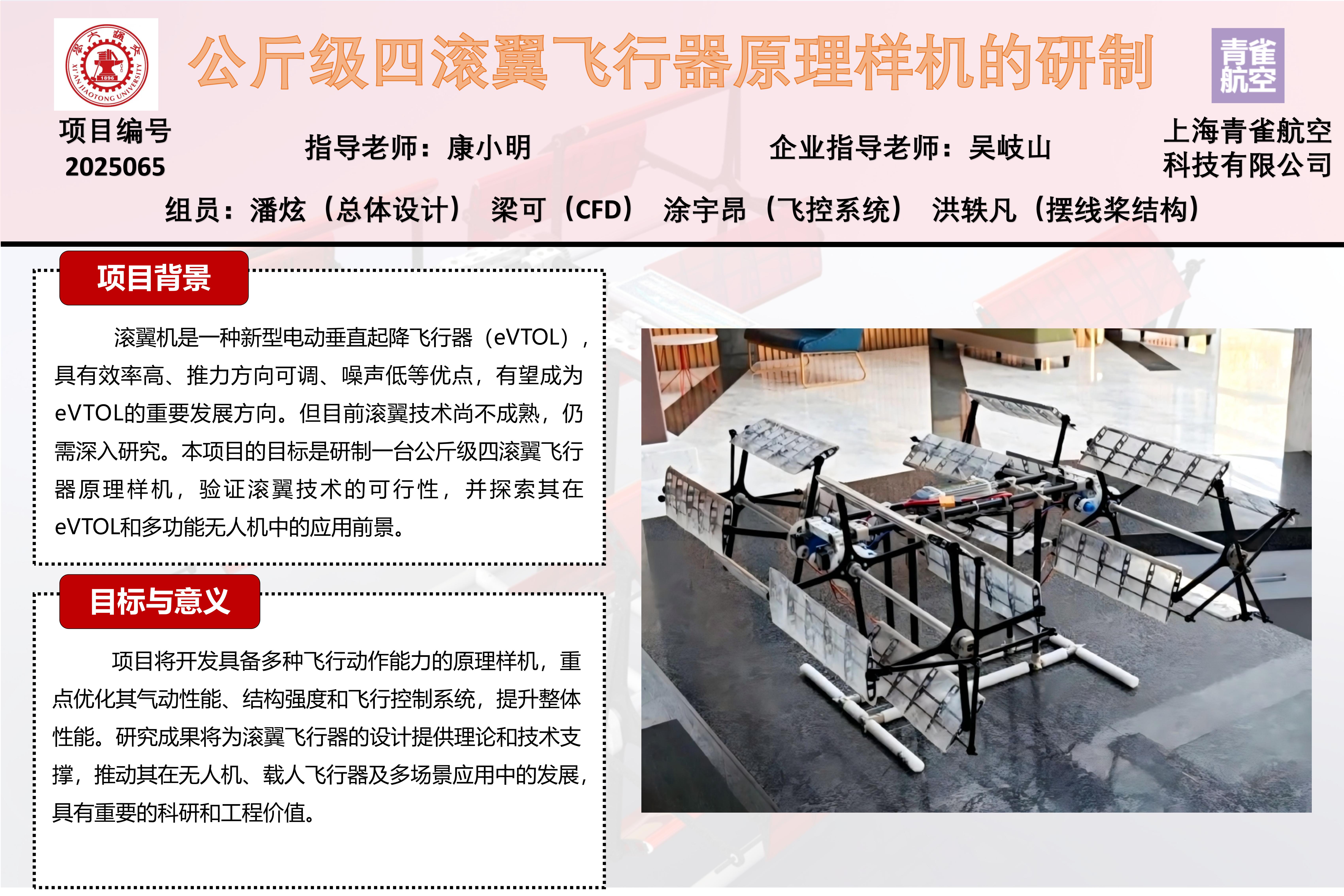 滾翼機是一種新型的電動垂直起降飛行器(electric Vertical Take-off and Landing,簡稱eVTOL),具有氣動效率高、推力矢量快速調(diào)節(jié)、氣動噪聲小、乘坐舒適等優(yōu)點,有望成為eVTOL發(fā)展的主流方向之一。然而,滾翼飛行器技術(shù)還很不成熟,急需進行深入研究。本項目旨在研制一臺公斤級四滾翼飛行器原理樣機,以驗證并優(yōu)化滾翼飛行技術(shù),推動該技術(shù)在電動垂直起降飛行器(eVTOL)及多功能無人飛行器中的應(yīng)用。