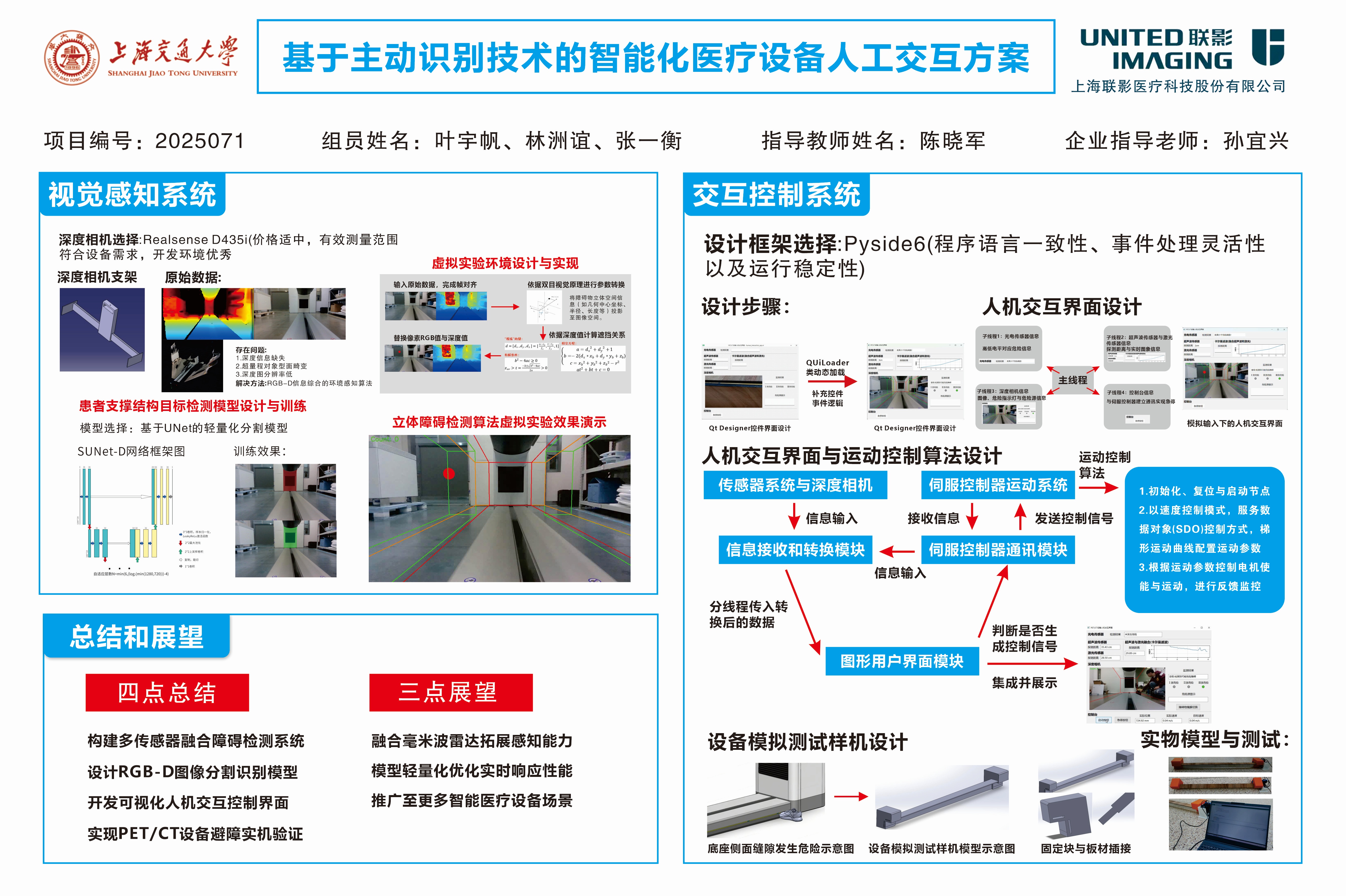 項目最終實現(xiàn)了一套集感知、識別、交互與控制于一體的智能避障系統(tǒng),并在真實醫(yī)療設備上完成了部署與驗證,體現(xiàn)出優(yōu)異的系統(tǒng)性能和應用前景。在感知層面,項目成功集成光電、激光和超聲波三類傳感器,形成覆蓋近遠距離的多模態(tài)障礙檢測網(wǎng)絡,結合深度相機提供的RGB-D信息,實現(xiàn)對復雜醫(yī)療場景中透明或非規(guī)則障礙物的穩(wěn)定識別。在算法方面,團隊自主提出融合RGB-D信息的輕量化圖像分割模型SUNet-D,并配套設計雙階段立體框障礙檢測策略,實現(xiàn)對患者支撐結構的精準識別與自動屏蔽,極大提高了系統(tǒng)整體識別精度與穩(wěn)定性。在控制與交互方面,開發(fā)了基于PySide6的圖形化人機界面,并完成與底層CANopen總線通信協(xié)議的集成,實現(xiàn)對伺服電機的有效控制與制動響應。系統(tǒng)已通過在聯(lián)影醫(yī)療平臺上的實機聯(lián)調(diào),達到了制動平穩(wěn)、安全防護可靠、用戶交互友好等多項性能指標,為后續(xù)醫(yī)療場景中智能化交互系統(tǒng)的推廣應用奠定了堅實基礎。