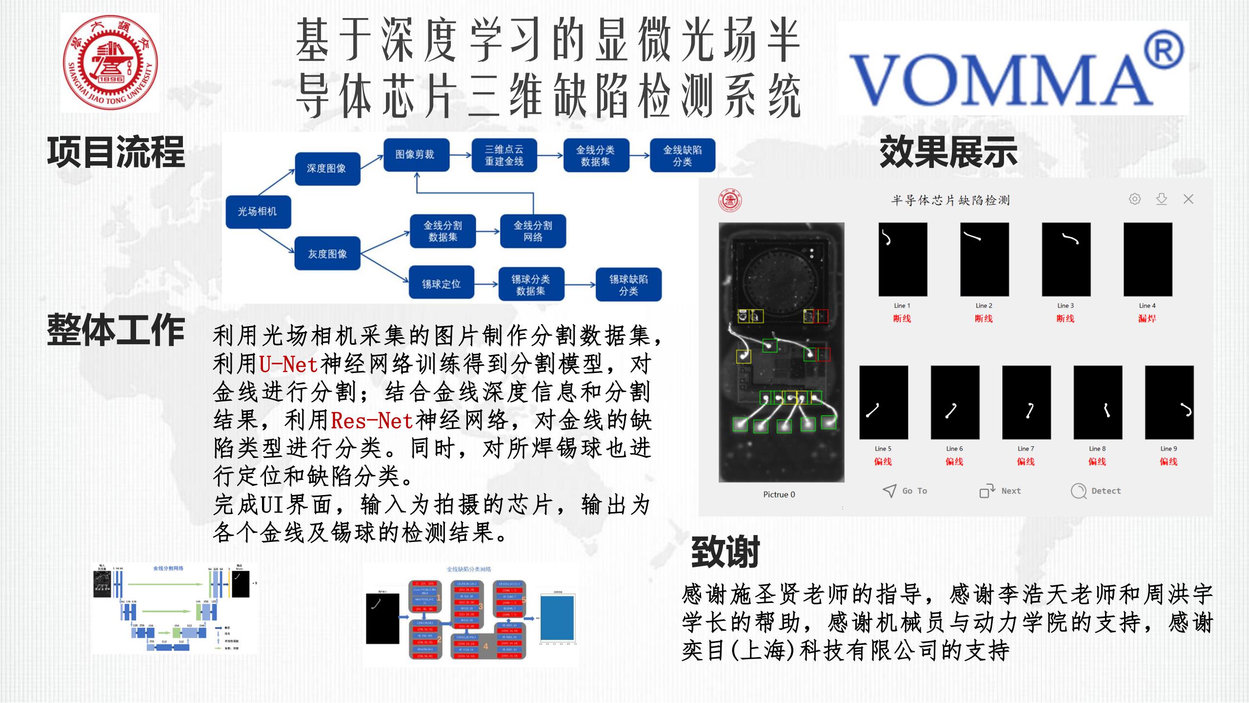針對(duì)“傳統(tǒng)相機(jī)+傳統(tǒng)檢測(cè)算法”方法在檢測(cè)芯片缺陷過(guò)程中過(guò)程復(fù)雜、耗時(shí)長(zhǎng)、準(zhǔn)確率低、不能檢測(cè)芯片三維缺陷等問(wèn)題,研發(fā)能夠快速檢測(cè)芯片所焊錫球和金線缺陷的人工智能算法,以解決當(dāng)前工業(yè)上檢測(cè)芯片缺陷難的問(wèn)題。同時(shí),利用公司已有的技術(shù)優(yōu)勢(shì)(光場(chǎng)相機(jī)技術(shù)),結(jié)合深度學(xué)習(xí)算法,搭建并訓(xùn)練適用于金線和錫球缺陷檢測(cè)的神經(jīng)網(wǎng)絡(luò)模型,研發(fā)自動(dòng)化檢測(cè)程序,將缺陷檢測(cè)流程中人工參與的比重降至最小,同時(shí)提高正確率。