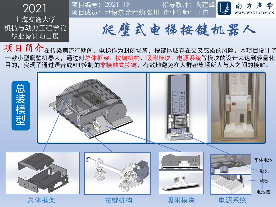 本項(xiàng)目設(shè)計(jì)了一款小型爬壁機(jī)器人,通過(guò)對(duì)總體框架、吸附模塊、按鍵機(jī)構(gòu)、電源系統(tǒng)等模塊的設(shè)計(jì)與優(yōu)化來(lái)達(dá)到輕量化目的,實(shí)現(xiàn)了通過(guò)語(yǔ)音或APP控制的非接觸式按鍵,有效地避免在人群密集場(chǎng)所人與人之間的接觸。