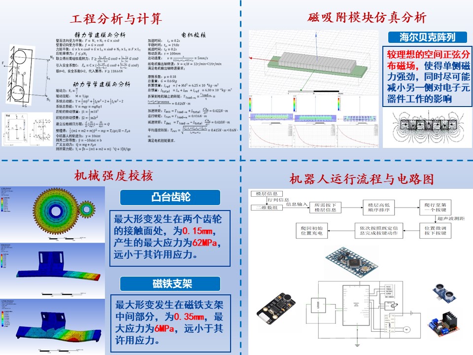 1、研發(fā)一套可獨(dú)立于電梯自身系統(tǒng)之外的非接觸式電梯按鍵機(jī)器人。機(jī)器人由總體框架、按鍵機(jī)構(gòu)、運(yùn)動(dòng)機(jī)構(gòu)、吸附模塊、電源系統(tǒng)等組成。總體框架選用鋁合金板作為材料,由板材拼裝而成;按鍵機(jī)構(gòu)則通過(guò)舵機(jī)帶動(dòng)凸輪軸轉(zhuǎn)動(dòng),凸輪與軸心的距離差實(shí)現(xiàn)按鍵操作;運(yùn)動(dòng)機(jī)構(gòu)使用減速電機(jī)通過(guò)齒輪傳動(dòng)帶動(dòng)后輪轉(zhuǎn)動(dòng);吸附模塊采用永磁體吸附,創(chuàng)新性地采用了海爾貝克陣列方式,使得爬壁穩(wěn)定性及可靠性得到了極大地提升;電源系統(tǒng)采用了“雙電池”模式,在減輕機(jī)器人主體重量的同時(shí)又能保證足夠的續(xù)航。