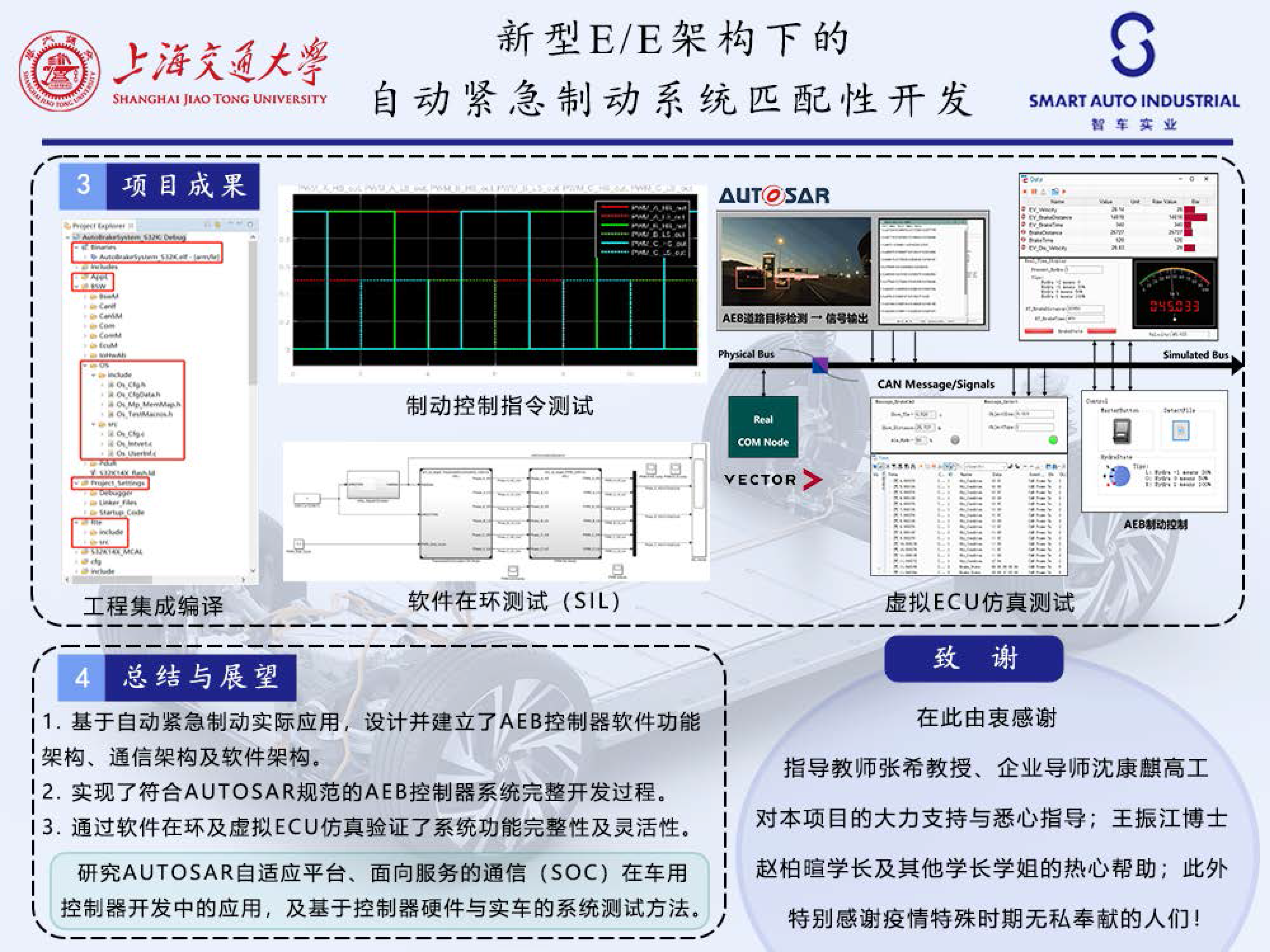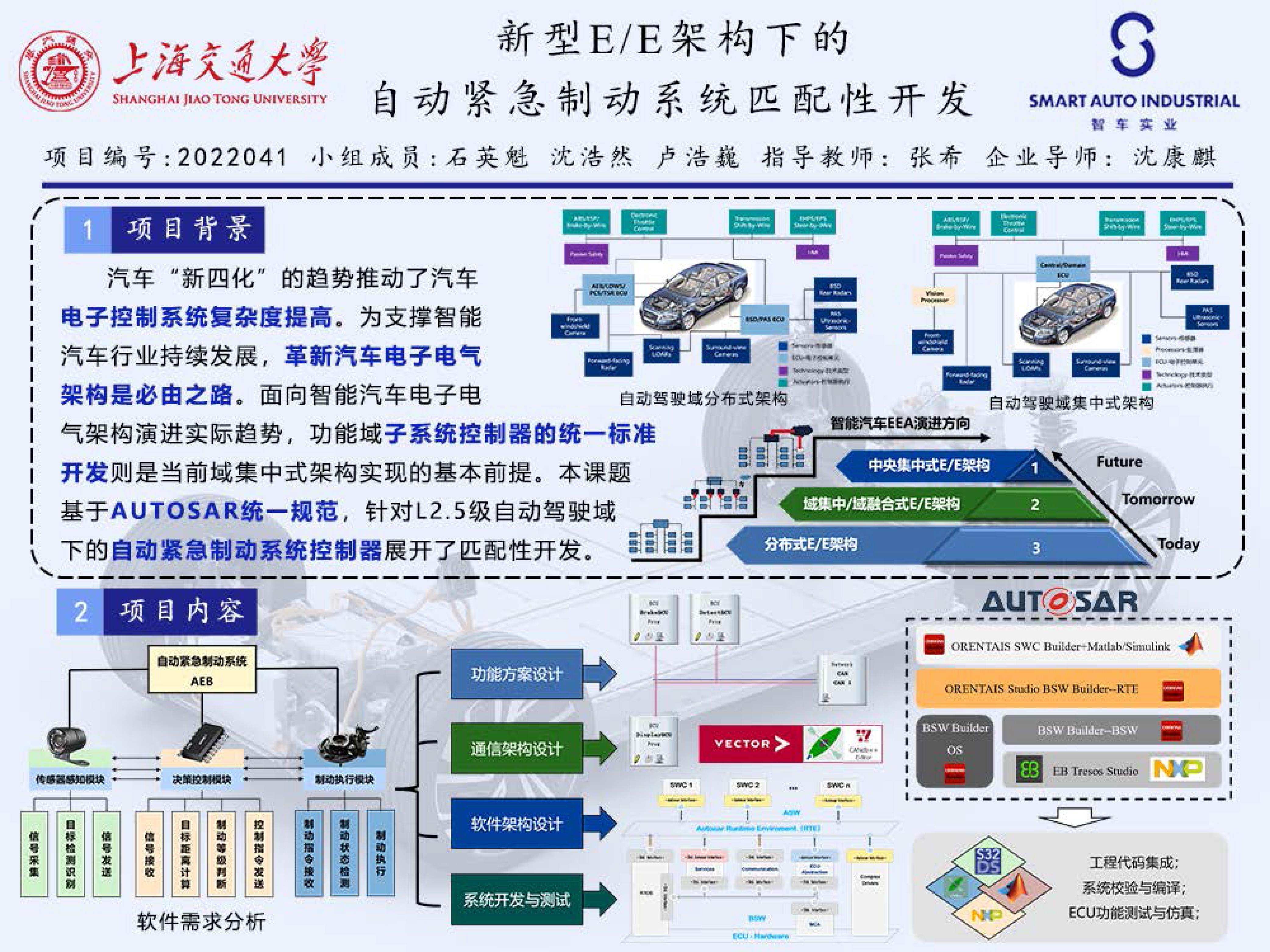 汽車“新四化”以及“軟件定義汽車”趨勢的不斷深化使得智能汽車系統(tǒng)復(fù)雜度提高,汽車電子電氣架構(gòu)革新成為必由之路,而功能域各子系統(tǒng)的統(tǒng)一標(biāo)準(zhǔn)開發(fā)與控制器融合是實現(xiàn)E/E架構(gòu)向集中式演進的前提。因此,本項目面向L2.5級自動駕駛的域集中式EEA發(fā)展,以自動緊急制動系統(tǒng)為研究對象,設(shè)計開發(fā)了一套完整的融合自動駕駛感知算法與基礎(chǔ)決策控制模型、符合AUTOSAR國際統(tǒng)一標(biāo)準(zhǔn)的控制器軟件平臺,并對系統(tǒng)模型進行了測試驗證,為智能汽車E/E架構(gòu)演進提供了支持與實踐。