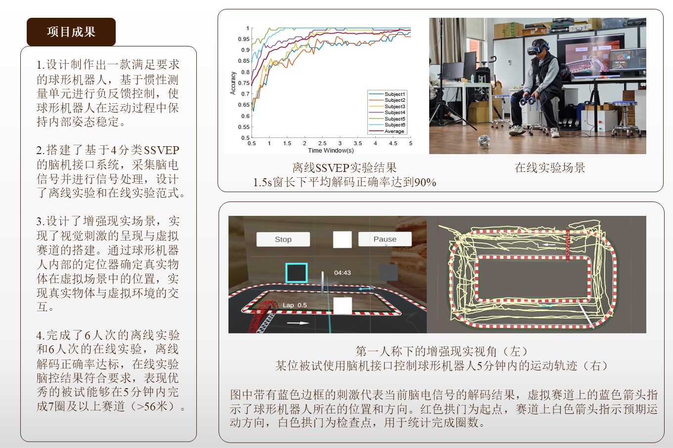 本項(xiàng)目要求球形機(jī)器人處于封閉球形空間內(nèi),具備透明外殼,直徑在 8-20cm 之間,重量在 2kg 以?xún)?nèi),外殼可拆卸并具備一定密封性。機(jī)器人能夠使用藍(lán)牙通信或使用無(wú)線網(wǎng)通信,可靠通信距離不小于15米,使用合理的控制算法控制球形機(jī)器人穩(wěn)定運(yùn)動(dòng)。機(jī)器人的腦機(jī)接口系統(tǒng)要求受試者的4類(lèi)SSVEP平均解碼正確率大于85%,完成5人次以上在線腦控球形機(jī)器人實(shí)驗(yàn)。借助增強(qiáng)現(xiàn)實(shí)設(shè)備,設(shè)計(jì)人機(jī)交互界面,識(shí)別球形機(jī)器人的位置并控制球形機(jī)器人在場(chǎng)景內(nèi)進(jìn)行運(yùn)動(dòng)。