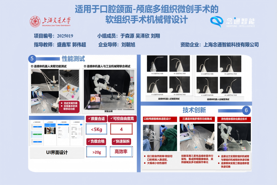本項(xiàng)目通過進(jìn)行連續(xù)體管的設(shè)計(jì)與仿真、拓展功能機(jī)械結(jié)構(gòu)設(shè)計(jì)、控制手柄的開發(fā)與UI界面設(shè)計(jì)、連續(xù)體運(yùn)動(dòng)算法模型建立與求解、視覺標(biāo)定等,設(shè)計(jì)了一款適用于口腔頜面-顱底軟組織手術(shù)的人機(jī)協(xié)作機(jī)械臂。通過連續(xù)體運(yùn)動(dòng)算法模型建立與求解,該軟組織手術(shù)機(jī)械臂能夠?qū)崿F(xiàn)精確抵達(dá)空間中不同位置。在控制手柄的輔助功能下,手術(shù)機(jī)械臂能夠?qū)崿F(xiàn)絲滑的運(yùn)動(dòng)以及末端手術(shù)器械的夾持操作。經(jīng)過實(shí)驗(yàn)測試,該機(jī)械臂能夠?qū)崿F(xiàn)物體的夾持?jǐn)[放功能等。