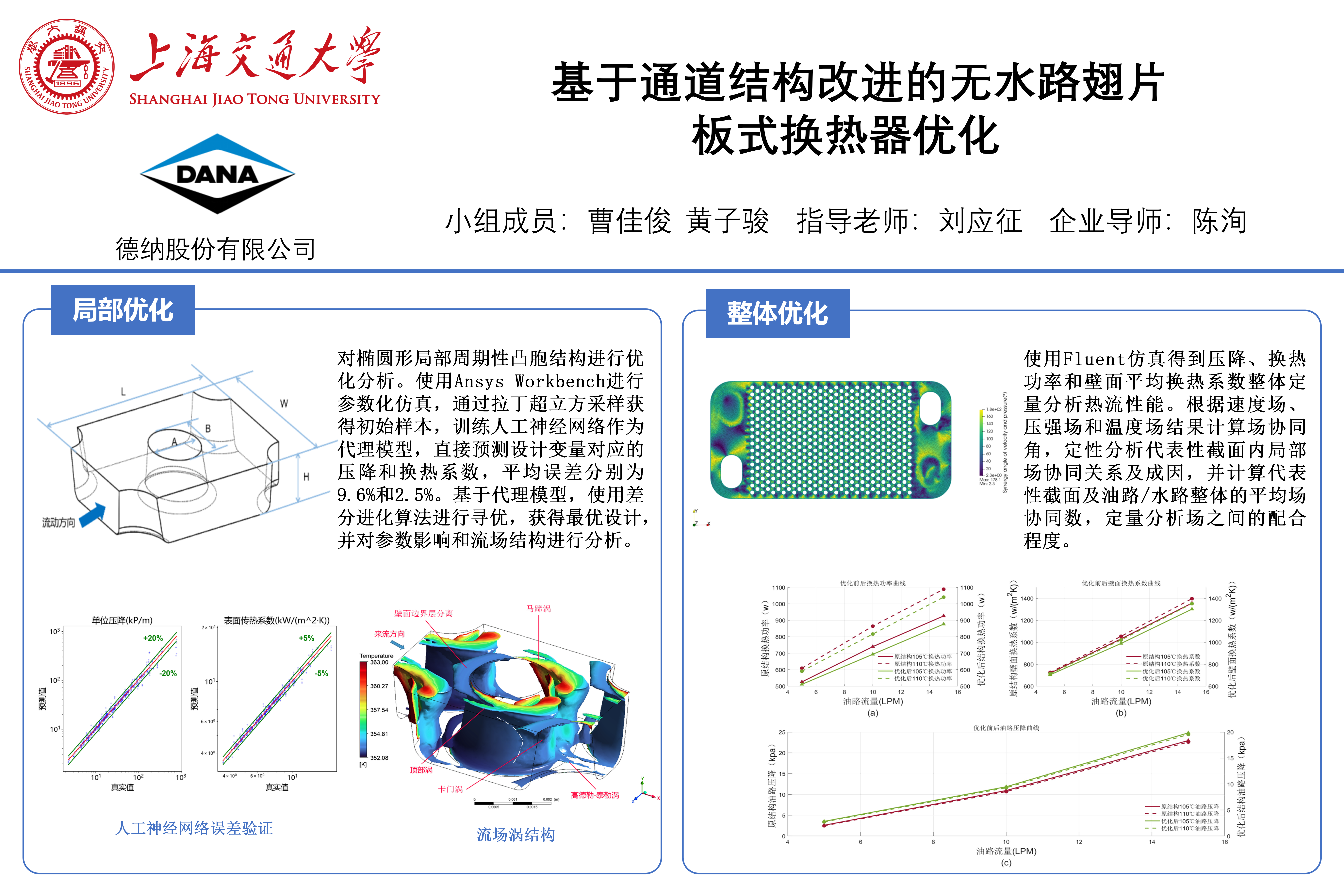 本項(xiàng)目的對(duì)象為企業(yè)方用于冷卻汽車電機(jī)的鋁制板翅片式換熱器。換熱器原結(jié)構(gòu)油路和水路中均添加翅片以強(qiáng)化繞流和換熱,卻損失了壓降和成本。本項(xiàng)目基于人工神經(jīng)網(wǎng)絡(luò)構(gòu)建代理模型,使用差分進(jìn)化算法優(yōu)化橢圓形凸胞結(jié)構(gòu),取消了原結(jié)構(gòu)水路翅片設(shè)計(jì)。使用Fluent軟件對(duì)原結(jié)構(gòu)和優(yōu)化后的結(jié)構(gòu)進(jìn)行熱流仿真,建立與實(shí)驗(yàn)結(jié)果符合的仿真范式,輸出壓降、換熱功率和場(chǎng)變量云圖等結(jié)果,并基于場(chǎng)協(xié)同理論分析優(yōu)化前后換熱器局部和整體的場(chǎng)協(xié)同性。