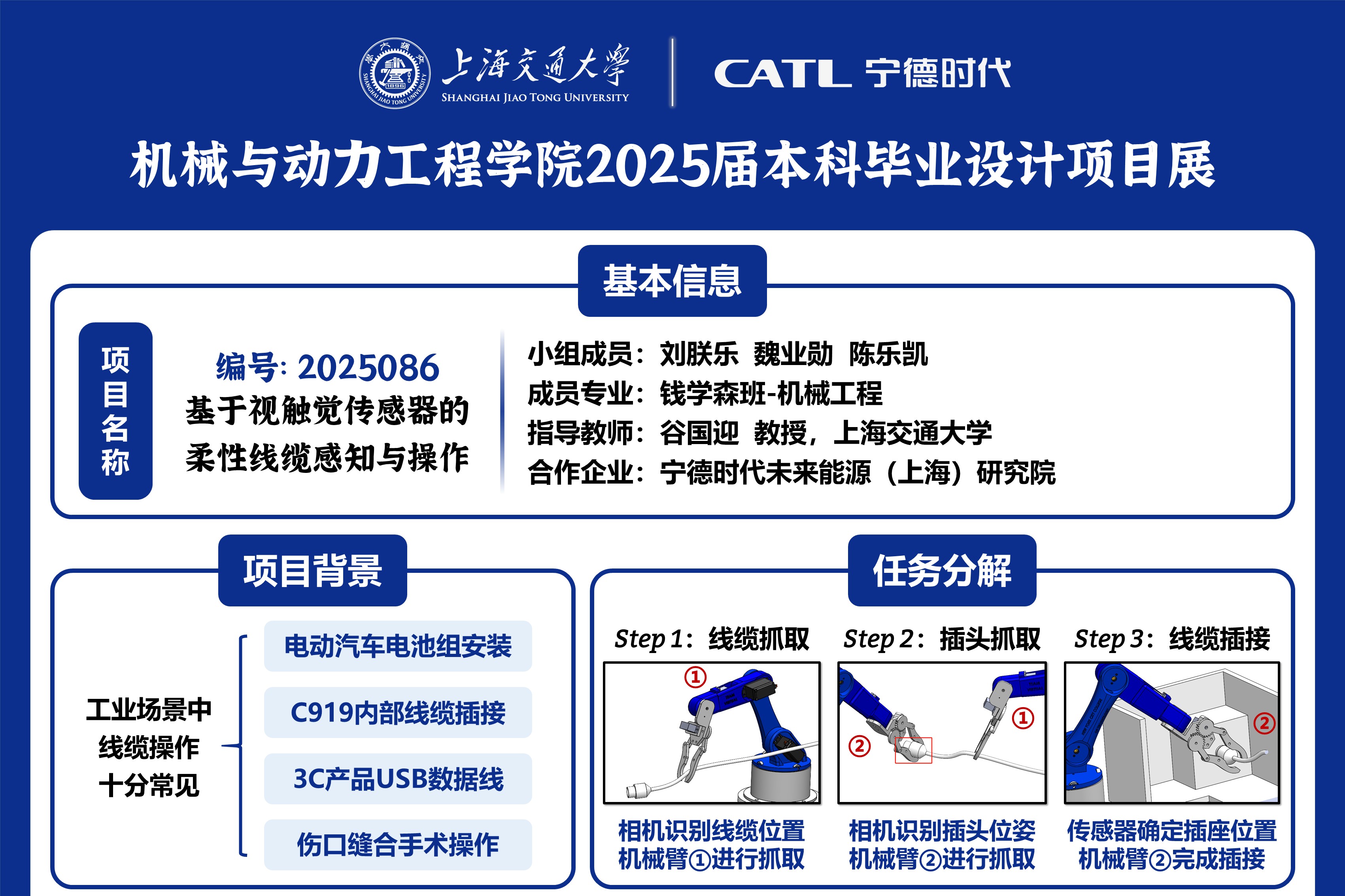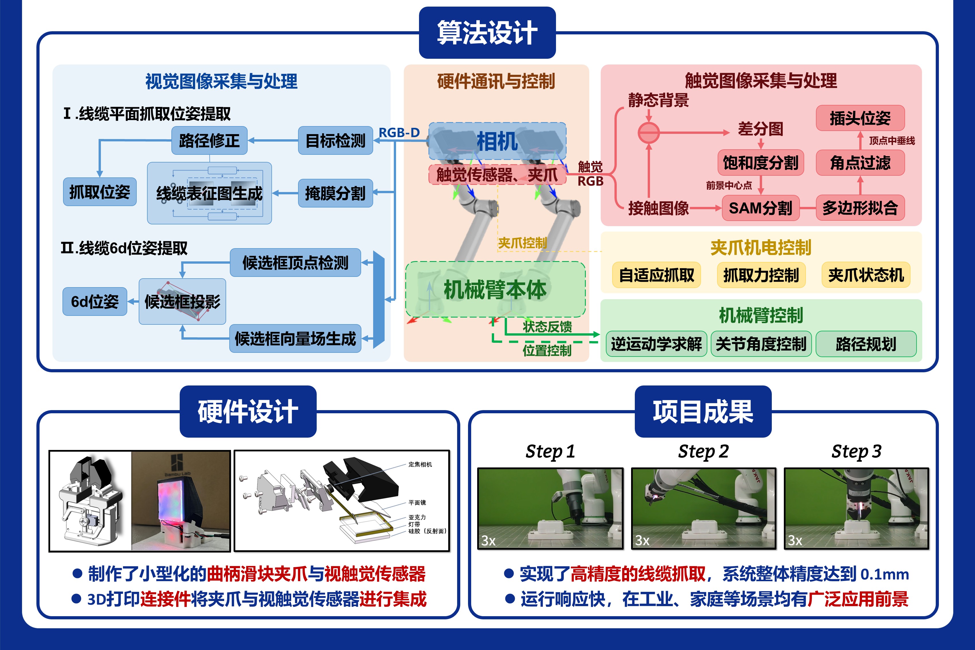(3)機電系統(tǒng)集成:優(yōu)化夾爪結構與雙臂協(xié)同架構,滿足狹小空間作業(yè)需求(如電池模組內部線纜插接),最終構建可部署的工業(yè)級原型系統(tǒng)。項目同時注重技術通用性,確保方案可擴展至其他柔性物體操作任務。