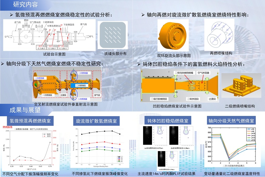 針對軸向分級再燃燃燒室的燃燒特性。本項目總結(jié)狹縫再燃與旋流再燃燃燒室對氫燃料火焰燃燒不穩(wěn)定性的抑制效果以及鈍體凹腔穩(wěn)焰技術(shù)對富氫燃料的穩(wěn)焰效果,并對相應的氮氧化合物排放特性進行了分析。通過對燃燒室火焰圖像、溫度與壓力脈動的試驗分析與仿真模擬,掌握了碳氫燃料燃燒條件下的流熱耦合機理。為高效低碳燃氣輪機燃燒室的國產(chǎn)化設計提供技術(shù)支持。
