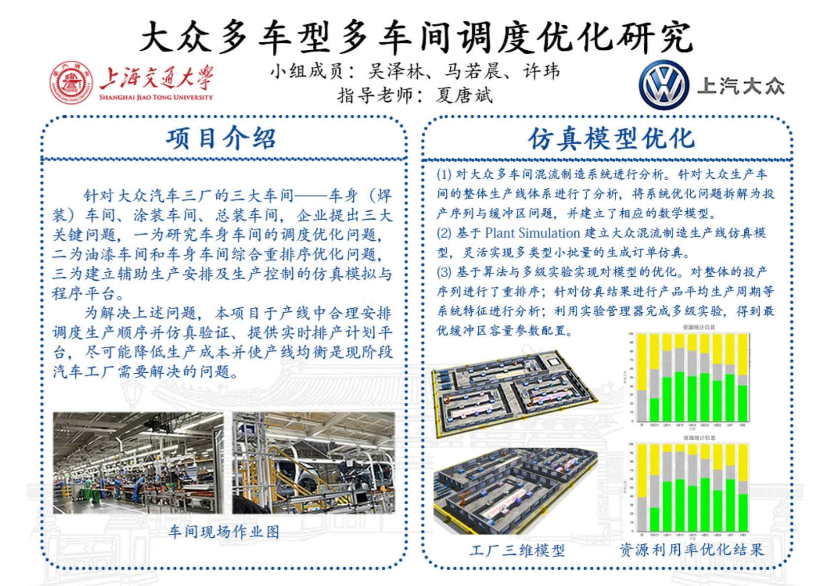 隨著經(jīng)濟(jì)全球化,汽車企業(yè)的競(jìng)爭(zhēng)日趨激烈,汽車制造車間必須能夠靈活滿足多樣性的訂單需求,實(shí)現(xiàn)以訂單為牽引的精益化、柔性化生產(chǎn)。本項(xiàng)目研究對(duì)象為上汽大眾安亭三廠的混合多車間加工產(chǎn)線,包括一個(gè)車身車間、一個(gè)油漆車間以及一個(gè)總裝車間。車間與車間之間串聯(lián)連接,不同車型在車間內(nèi)部的加工路線提前確定,是一個(gè)大規(guī)模多車型柔性生產(chǎn)線。其生產(chǎn)路徑復(fù)雜,限制條件多,對(duì)于精準(zhǔn)的生產(chǎn)安排及生產(chǎn)控制有著迫切需求。故確立項(xiàng)目主題為通過(guò)建立模型、算法求解和軟件仿真進(jìn)行生產(chǎn)調(diào)度研究,提高效率,優(yōu)化瓶頸;并搭建程序平臺(tái)實(shí)現(xiàn)排產(chǎn)計(jì)劃信息交互性的查詢與調(diào)整管理。