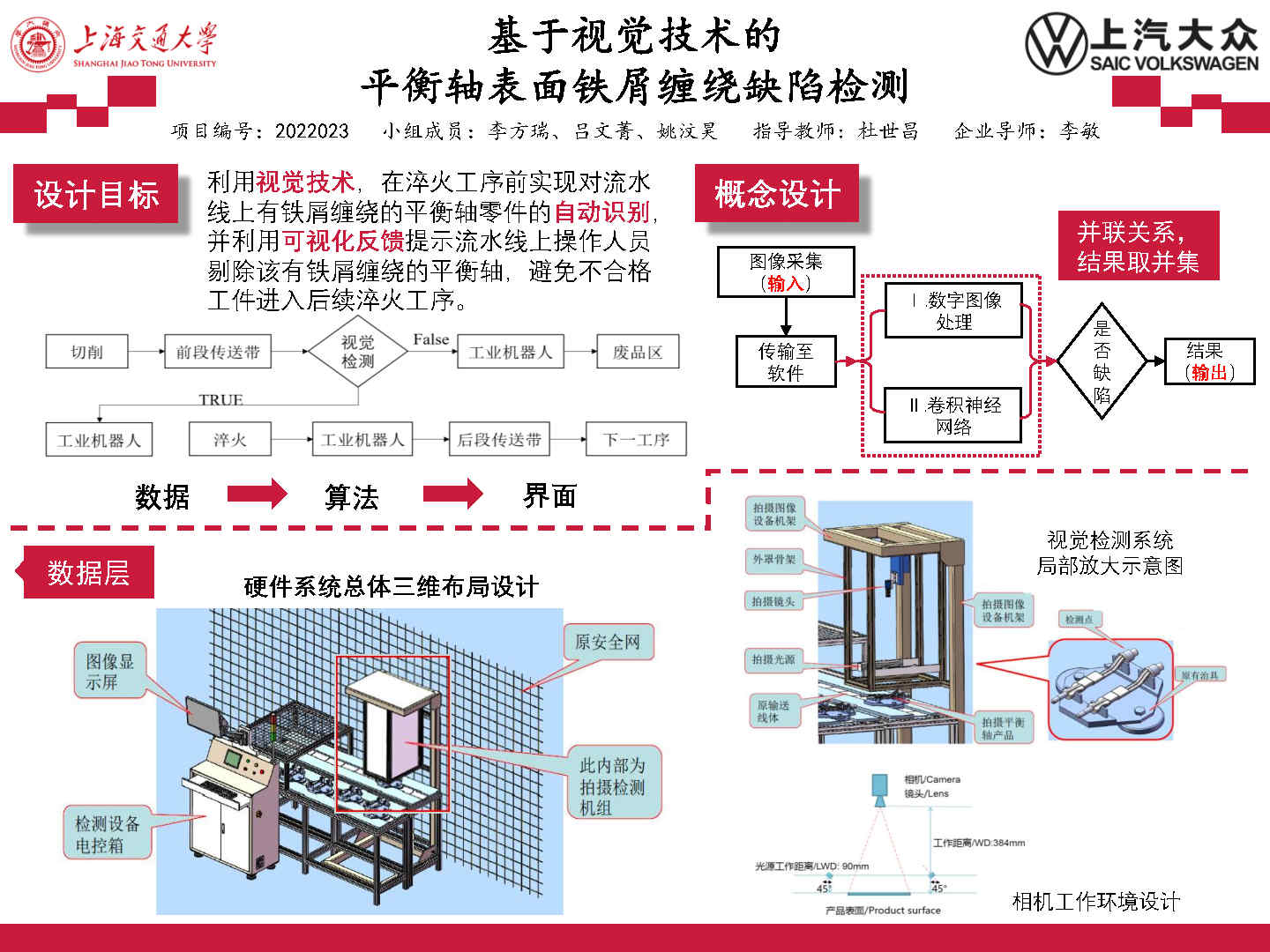 本項(xiàng)目針對企業(yè)自動(dòng)識別平衡軸表面鐵屑纏繞缺陷的實(shí)際需求,使用數(shù)字圖像和卷積神經(jīng)網(wǎng)絡(luò)兩種視覺技術(shù)進(jìn)行互補(bǔ),最大程度在實(shí)現(xiàn)檢測自動(dòng)化的同時(shí)保持高準(zhǔn)確率,同時(shí)設(shè)計(jì)了配套的軟件系統(tǒng)及用戶界面,最終較好地完成了企業(yè)方自動(dòng)識別有鐵屑纏繞平衡軸工件并提供可視化反饋的需求,避免了依賴操作人員進(jìn)行人工肉眼識別產(chǎn)線上平衡軸是否存在缺陷的成本高、效率低的情況,解決了工業(yè)生產(chǎn)中的實(shí)際問題。