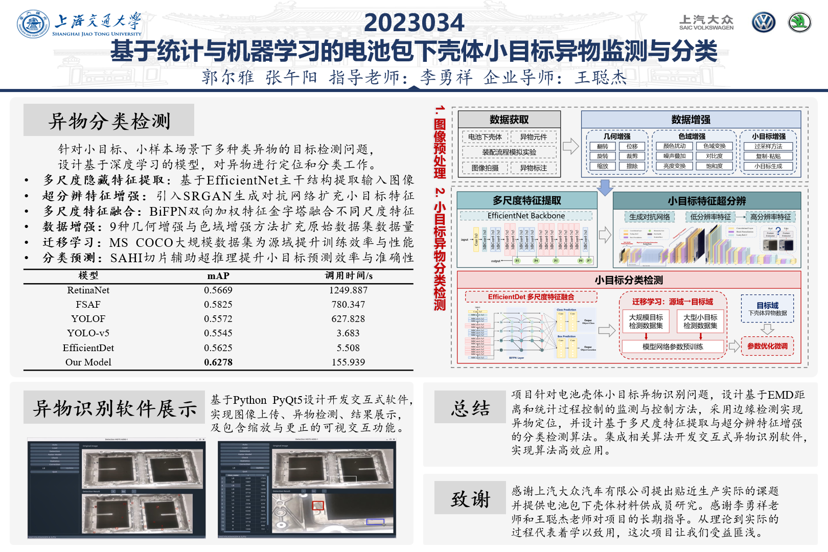 依賴(lài)人工目視檢查的電池包裝配過(guò)程異物識(shí)別方式易導(dǎo)致異物遺留,影響產(chǎn)品安全并增加生產(chǎn)成本。針對(duì)合作企業(yè)裝配車(chē)間異物目標(biāo)小、可供判別特征缺乏、檢測(cè)精度要求高的實(shí)際異物識(shí)別難點(diǎn),本項(xiàng)目建立基于統(tǒng)計(jì)方法的異物監(jiān)測(cè)與定位算法,和基于深度學(xué)習(xí)算法的小目標(biāo)異物分類(lèi)檢測(cè)框架;并設(shè)計(jì)開(kāi)發(fā)交互式異物識(shí)別軟件,使異物識(shí)別算法有效地落實(shí)到企業(yè)生產(chǎn)實(shí)際。該算法應(yīng)用于工位m070,在模組入箱前進(jìn)行異物監(jiān)測(cè)分類(lèi),滿(mǎn)足產(chǎn)線(xiàn)生產(chǎn)節(jié)拍需求。