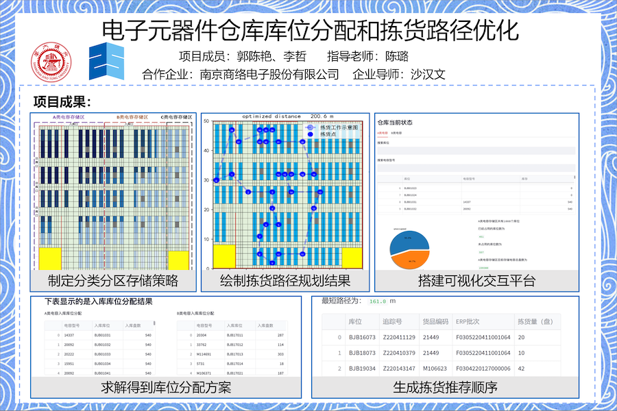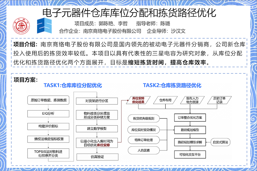 南京商絡(luò)電子股份有限公司是一家國(guó)內(nèi)領(lǐng)先的被動(dòng)電子元器件分銷商,主要面向網(wǎng)絡(luò)通信、消費(fèi)電子、汽車電子、工業(yè)控制等應(yīng)用領(lǐng)域的電子產(chǎn)品制造商,為其提供電子元器件產(chǎn)品。隨著公司業(yè)務(wù)的不斷發(fā)展,公司在南京濱江開(kāi)發(fā)區(qū)新建了自己的供應(yīng)鏈基地并于2022年10正式搬入供應(yīng)鏈基地的新倉(cāng)庫(kù)。對(duì)于新倉(cāng)庫(kù)投入使用后存在的揀貨效率有待提升的問(wèn)題,本項(xiàng)目規(guī)劃調(diào)整倉(cāng)庫(kù)庫(kù)存電容的庫(kù)位分配,并且設(shè)計(jì)揀貨路徑規(guī)劃方式,縮短公司倉(cāng)庫(kù)電容入庫(kù)、出庫(kù)平均時(shí)間,并搭建倉(cāng)庫(kù)作業(yè)交互管理平臺(tái),提升企業(yè)倉(cāng)庫(kù)運(yùn)作效率。