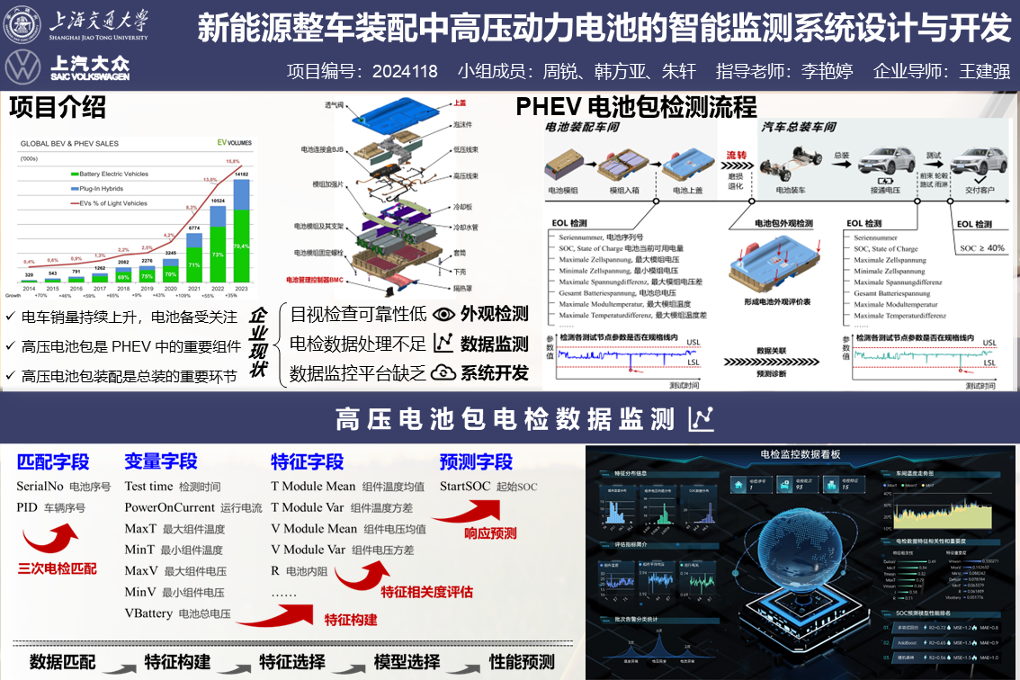本項目針對當前上汽大眾在推動電動汽車產(chǎn)線建設(shè)中PHEV高壓電池包裝配過程中存在的缺陷檢測不準確、電檢數(shù)據(jù)利用率低和作業(yè)安全風險問題,提出了一套綜合機器視覺和數(shù)據(jù)分析方法的PHEV高壓電池包裝配全流程自動化監(jiān)測系統(tǒng)。通過分析電池包生產(chǎn)與裝配流程,開發(fā)了基于機器視覺和神經(jīng)網(wǎng)絡(luò)的外觀缺陷檢測算法,利用數(shù)據(jù)分析技術(shù)構(gòu)建了關(guān)鍵性能指標的預(yù)測系統(tǒng),并設(shè)計了集成以上功能的自動化監(jiān)測軟件。該系統(tǒng)顯著提高了缺陷檢測的準確性與作業(yè)的安全性,同時通過有效的數(shù)據(jù)監(jiān)控與分析,提升了質(zhì)量控制的效率和響應(yīng)速度,為上汽大眾提供了一套操作簡便、數(shù)據(jù)可追溯的質(zhì)量監(jiān)控解決方案,有力支持了企業(yè)的自動化轉(zhuǎn)型戰(zhàn)略。
