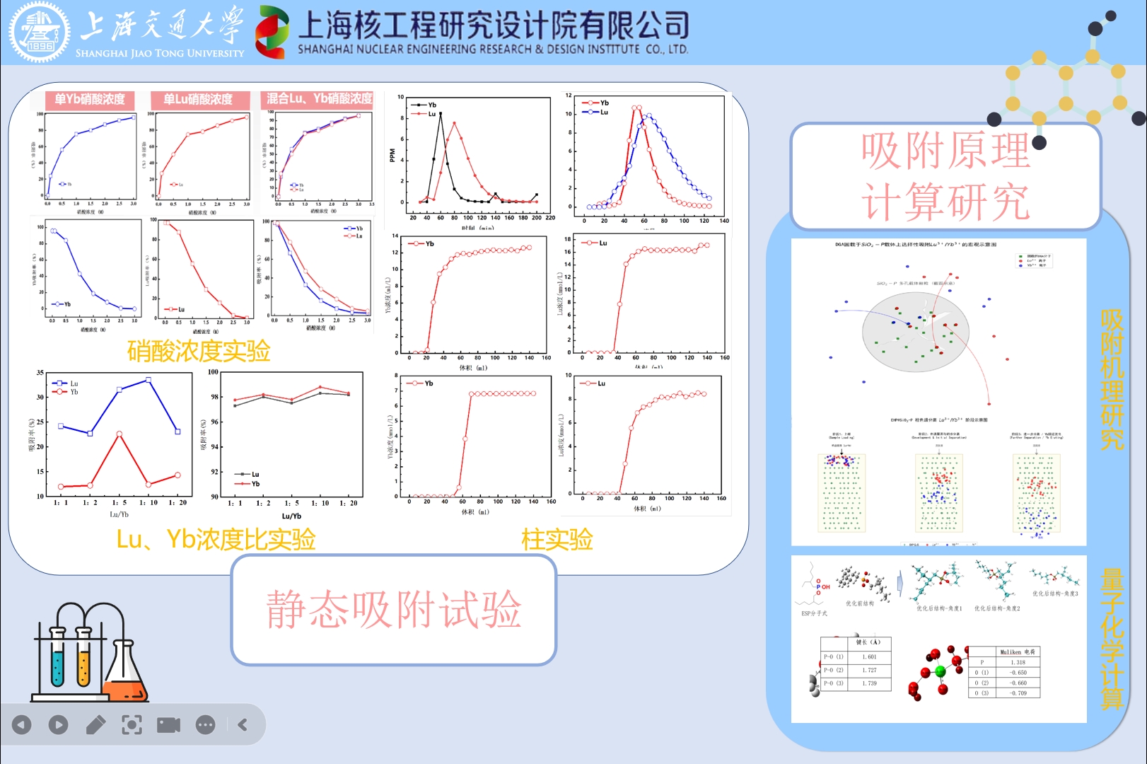 通過真空灌裝法制備了兩種吸附材料,即DGA/SiO2-P與EHP/SiO2-P;綜合采用掃描電鏡、紅外光譜、熱重分析等手段對合成材料進(jìn)行了表征;通過靜態(tài)吸附試驗,對材料進(jìn)行了不同酸度吸附實驗、吸附動力學(xué)實驗、容量實驗等試驗,探究了材料的靜態(tài)吸附性能;通過DFT計算等量子化學(xué)計算手段,對材料的結(jié)構(gòu)、吸附機(jī)理、吸附行為等進(jìn)行了探究;綜合以上實驗成果進(jìn)行了動態(tài)吸附柱實驗,驗證了工藝流程的合理性,EHP色譜柱對Lu的單次通過的富集度達(dá)到了80%以上。