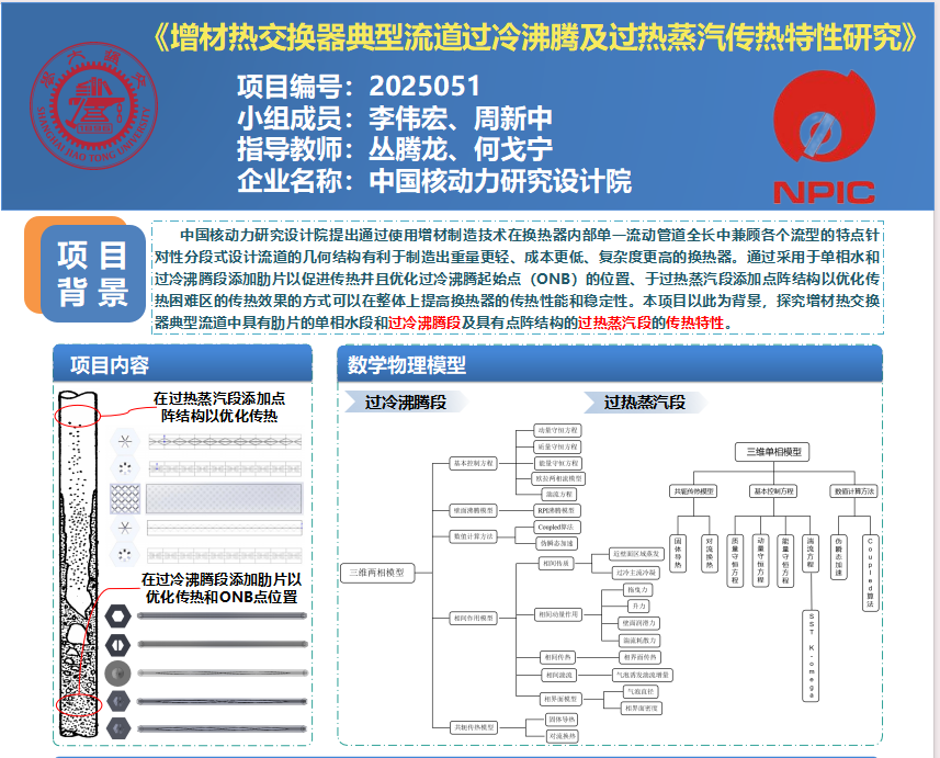 中國(guó)核動(dòng)力研究設(shè)計(jì)院提出通過使用增材制造技術(shù)在換熱器內(nèi)部單一流動(dòng)管道全長(zhǎng)中兼顧各個(gè)流型的特點(diǎn)針對(duì)性分段式設(shè)計(jì)流道的幾何結(jié)構(gòu)有利于制造出重量更輕、成本更低、復(fù)雜度更高的換熱器。通過采用于單相水和過冷沸騰段添加肋片以促進(jìn)傳熱并且優(yōu)化過冷沸騰起始點(diǎn)(ONB)的位置、于過熱蒸汽段添加點(diǎn)陣結(jié)構(gòu)以優(yōu)化傳熱困難區(qū)的傳熱效果的方式可以在整體上提高換熱器的傳熱性能和穩(wěn)定性。本項(xiàng)目以此為背景,探究增材熱交換器典型流道中具有肋片的單相水段和過冷沸騰段及具有點(diǎn)陣結(jié)構(gòu)的過熱蒸汽段的傳熱特性。