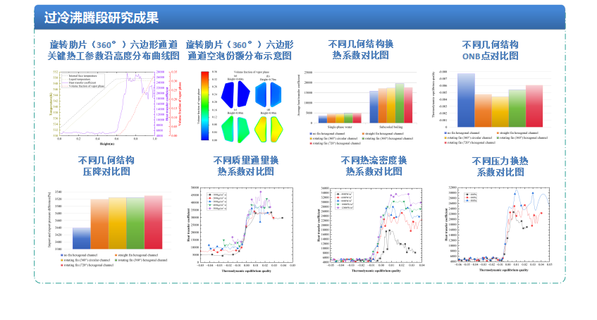 在增材熱交換器典型流道過冷沸騰傳熱特性研究中,分析無肋片六邊形通道、直肋片六邊形通道、旋轉(zhuǎn)肋片(360°)六邊形通道、旋轉(zhuǎn)肋片(720°)六邊形通道和旋轉(zhuǎn)肋片(360°)圓形通道的流動(dòng)特性和傳熱特性,并且探究幾何結(jié)構(gòu)、壓力、熱流密度和質(zhì)量通量對(duì)于流動(dòng)傳熱特性的影響與作用機(jī)理。在增材熱交換器典型流道過熱蒸汽傳熱特性研究中,分析帶有多種類型點(diǎn)陣的六邊形通道的流動(dòng)特性和傳熱特性。并且探究幾何結(jié)構(gòu)和關(guān)鍵熱工參數(shù)對(duì)于流動(dòng)傳熱特性的影響與作用機(jī)理。