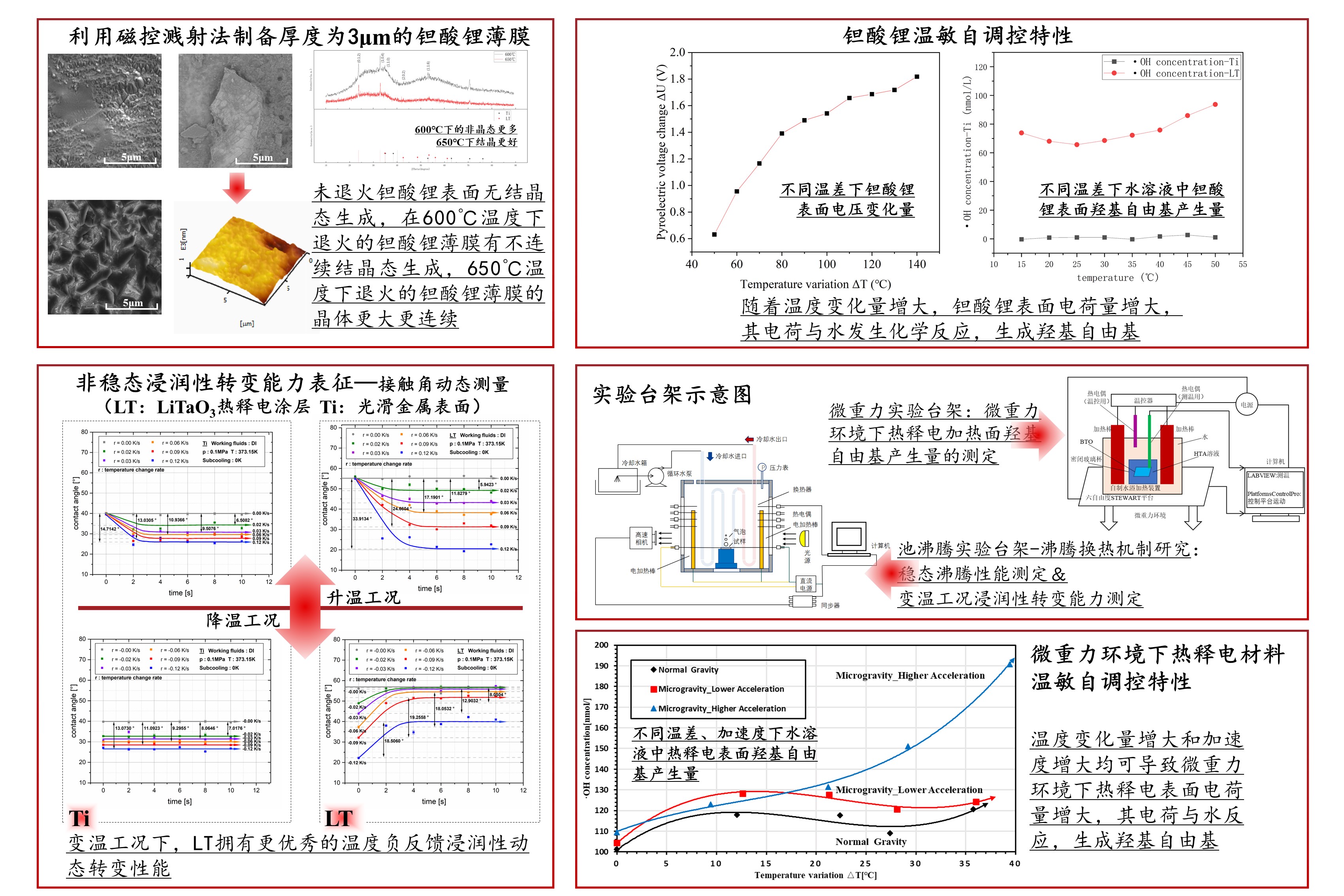 本項(xiàng)目成功在金屬鈦襯底上制備了微米厚度的高致密熱釋電涂層,并完成了對熱釋電涂層晶體的結(jié)構(gòu)分析、涂層表面與斷面圍觀形貌分析,得到了溫度變化與表面自由基產(chǎn)生量的關(guān)系曲線;成功設(shè)計(jì)并搭建了池沸騰試驗(yàn)臺(tái)架,并在穩(wěn)態(tài)下獲得了熱釋電涂層對沸騰傳熱增強(qiáng)的定量關(guān)系,非穩(wěn)態(tài)下獲得了熱釋電材料基于溫度負(fù)反饋的浸潤性自適應(yīng)變化效應(yīng)的定量關(guān)系,評估了各影響因素對實(shí)驗(yàn)結(jié)果的影響,總結(jié)出了熱釋電材料表面浸潤性溫敏自適應(yīng)調(diào)節(jié)的定量關(guān)系;成功設(shè)計(jì)并裝配了微重力環(huán)境的模擬裝置,探究了熱釋電材料在變溫及微重力環(huán)境下的浸潤性改變的機(jī)理,并利用化學(xué)方法對微重力環(huán)境下熱釋電材料的浸潤性進(jìn)行了分析。