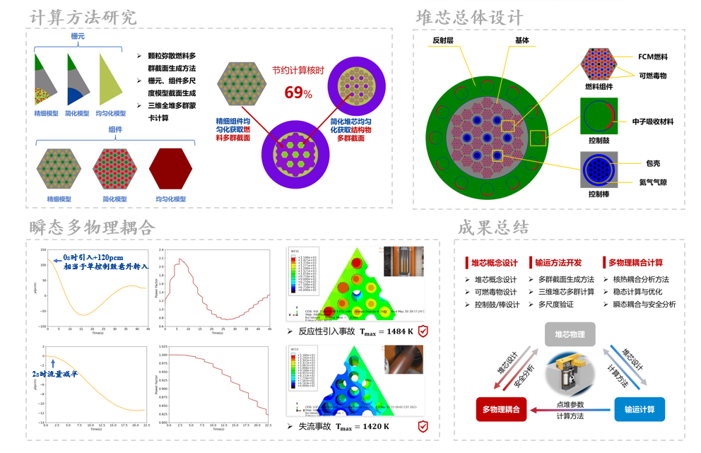 (3)在堆芯多物理耦合研究方面,建立了基于彌散模型修正的Chiew & Glandt Model的顆粒燃料等效熱導(dǎo)率計算模型,通過多群截面生成方法獲取緩發(fā)中子份額、衰變常數(shù)和中子代時間中子動力學(xué)參數(shù),使用六分之一組件開發(fā)了核熱流耦合穩(wěn)態(tài)與瞬態(tài)計算模型,完成了穩(wěn)態(tài)運(yùn)行優(yōu)化和事故瞬態(tài)模擬。