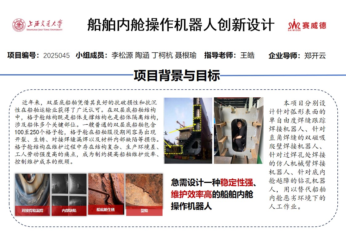 本項(xiàng)目旨在項(xiàng)目組中的每個(gè)成員根據(jù)不同的焊接場(chǎng)景分別設(shè)計(jì)針對(duì)弧形表面的單自由度焊縫跟蹤焊接機(jī)器人、針對(duì)直角焊縫的雙磁吸爬壁焊接機(jī)器人、針對(duì)過(guò)焊孔處焊接的仿人機(jī)械臂焊接機(jī)器人、針對(duì)底內(nèi)艙越障的鉆孔機(jī)器人,用以替代船舶內(nèi)艙惡劣環(huán)境下的人工作業(yè)。這些機(jī)器人相較于傳統(tǒng)人工作業(yè),既節(jié)省了人力成本,效率也顯著提升,工作過(guò)程的安全性也能得到保障,對(duì)維護(hù)船舶結(jié)構(gòu)的穩(wěn)定性具有重要作用。