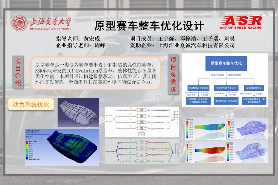 原型賽車是一類專為賽車賽事設(shè)計和制造的高性能賽車,相比量產(chǎn)車,原型賽車更注重極致的操控性能,設(shè)計過程中需要大量創(chuàng)新與測試,以實現(xiàn)高速、精確操控、耐久性與安全性的統(tǒng)一。由上海匯業(yè)眾誠汽車科技有限公司(ASR車隊)研發(fā)的TC1-Evolution原型車,基于FIA(國際汽車聯(lián)合會)CN2組別規(guī)范,具備輕量化、高效能和出色操控性等優(yōu)勢。盡管該車型目前已在較低成本下實現(xiàn)了良好操控表現(xiàn),但在發(fā)動機(jī)動力總成、空氣動力學(xué)布局以及懸掛幾何等方面仍存在設(shè)計粗糙、缺乏系統(tǒng)理論和仿真支撐的問題,整體性能存在顯著優(yōu)化空間,需通過系統(tǒng)化升級提升整車競爭力。